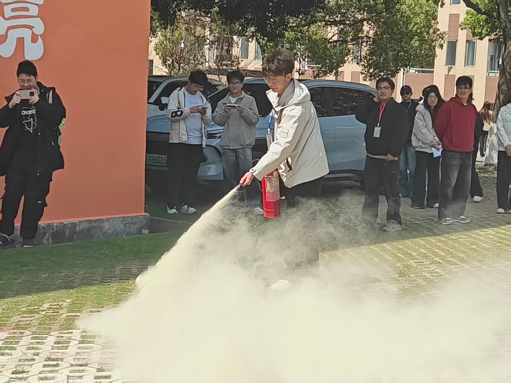 最后,现场开展消防知识讲解与灭火器实操教学。工作人员现场示范灭火器“提、拔、握、压”使用要领,讲解初期火灾扑救方法,并指导学生逐一上手操作,让大家真正掌握消防器材使用技能,把安全知识转化为实战能力。