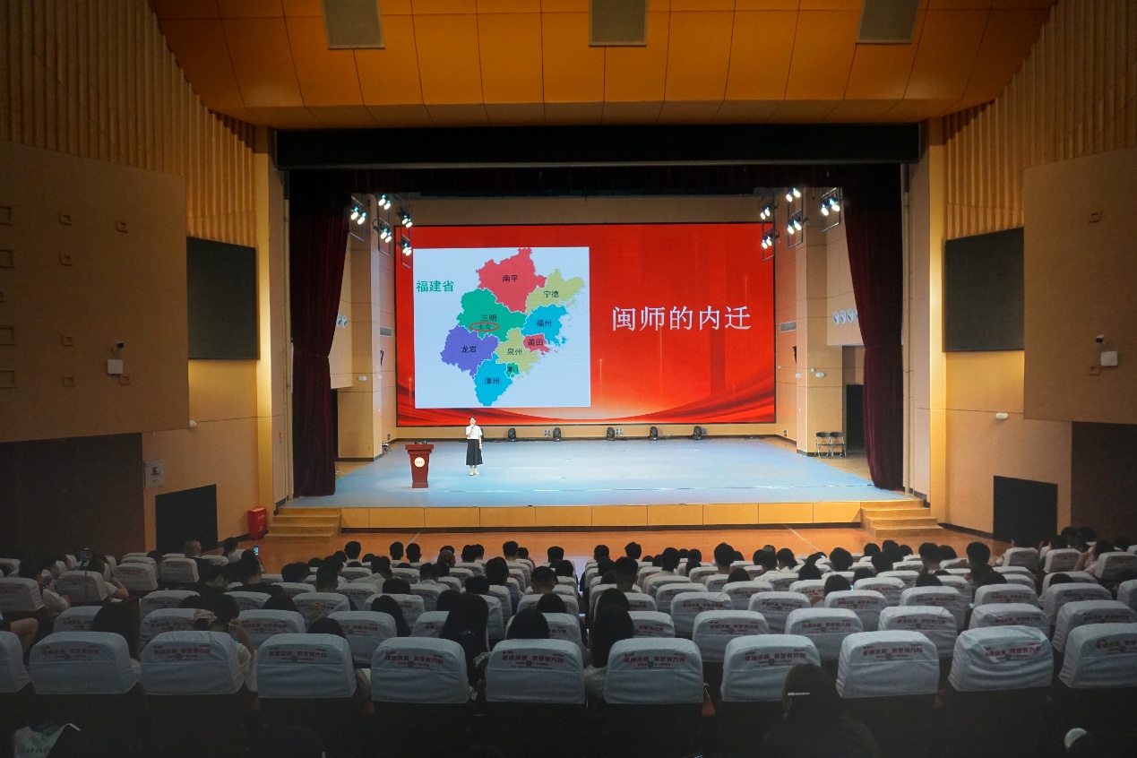 在适应指导环节,许舒敏老师围绕宿舍关系、专业学习与课余规划展开讲解,结合典型案例,分析作息差异、卫生分歧等常见问题,引导学生以尊重包容和有效沟通化解矛盾,并强调打好专业基础、合理安排课余时间的重要性。校史分享环节中,王佳莹同学以学校前身——福建省立师范学校的发展历程为主线,介绍了“三杆教育”理念,讲述了抗战时期师生坚持“树林课堂”、自建教室等事迹,展现了学校胸怀国家、艰苦奋斗的优良传统。