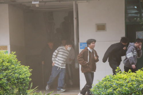 随着三声清脆的哨响,居住在荷花苑2号楼的同学们迅速行动起来,他们按照预先规划的疏散路线,有条不紊地从各楼层撤离至安全区域。整个过程,同学们严格遵守消防安全规程,用湿毛巾捂住口鼻、弯腰低行,以最快速度完成疏散任务。