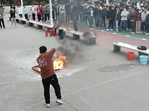 紧接着,校消防队员为同学们带来了一场生动的灭火器使用教学,他们详细讲解了灭火器的正确使用方法以及关键灭火技巧,现场邀请五名同学进行实操演练。在校消防队员的悉心指导下,同学们逐渐掌握了灭火器的使用要领。