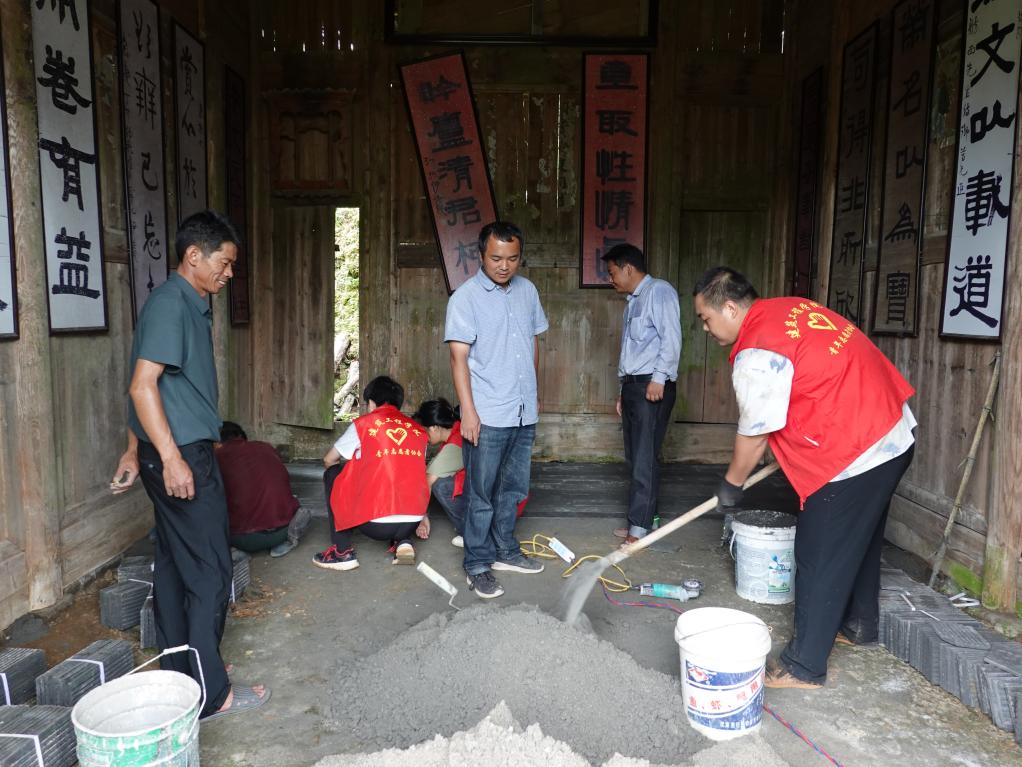 (实践团队为展览馆铺设地板砖。三明学院建筑工程学院供图)