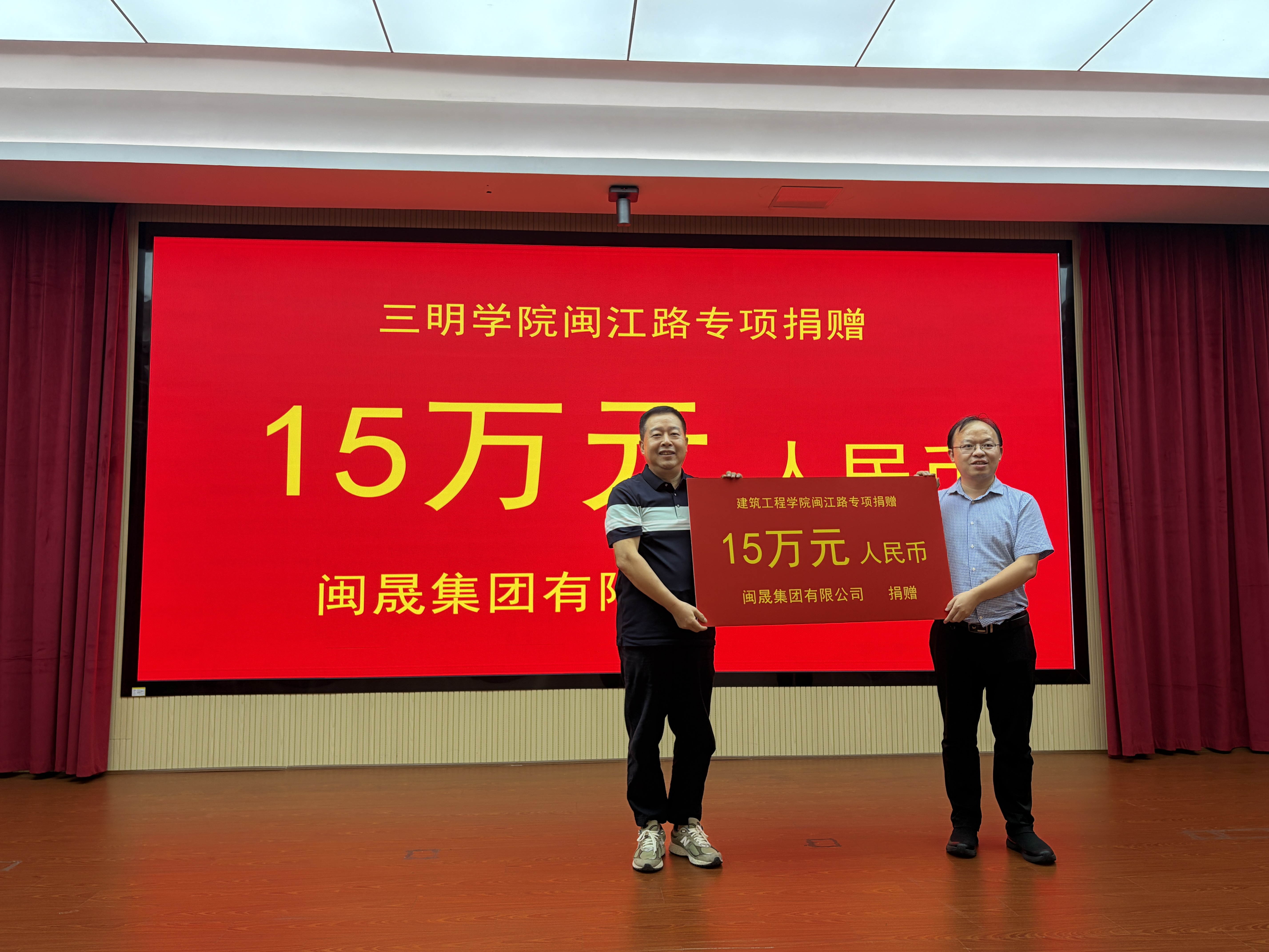 仪式现场,闽晟集团叶德福董事长与三明学院陈日清副校长共同完成30万元建筑工程学院事业发展基金的捐赠。随后,集团李伟副总裁以校友与企业代表双重身份,与建筑工程学院主持工作副院长曾武华教授一道,完成15 万元闽江路专项资金的捐赠。最后,校统战部部长、校友会秘书长龚榕容老师上台,代表三明学院校友会向闽晟集团有限公司颁发捐赠证书,叶德福董事长代表集团领取证书,以此表彰其在支持高等教育、助力学院发展中的突出贡献。