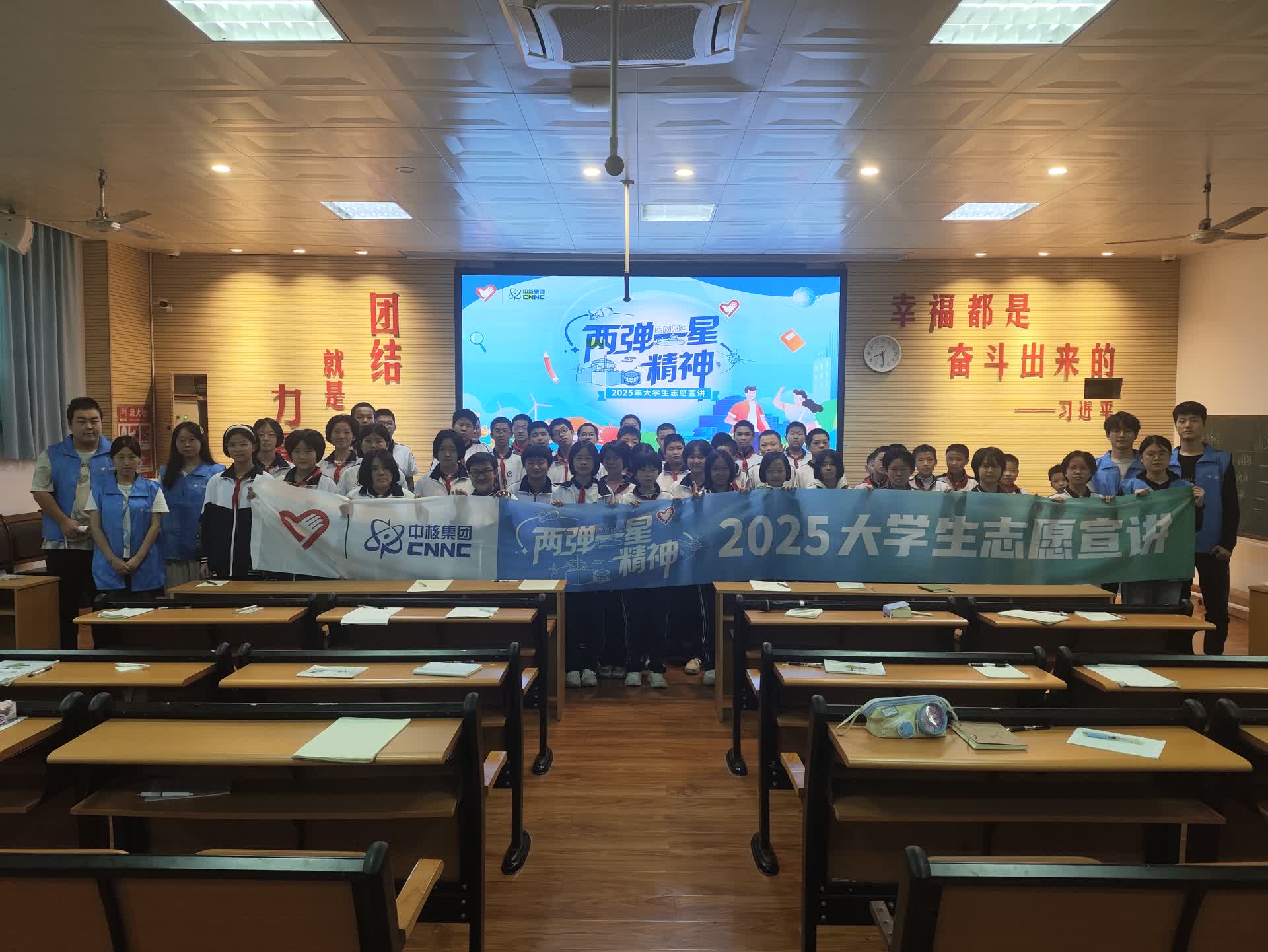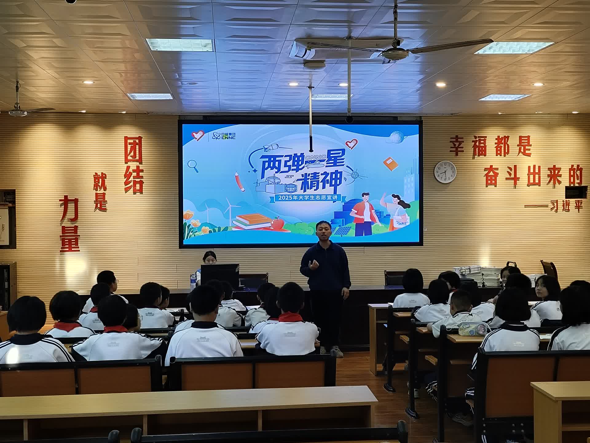 宣讲过程中,宣讲团成员以通俗易懂的语言、丰富详实的图片资料为支撑,系统介绍“华龙一号”这一我国自主研发的三代核电技术核心内容。为破解专业知识晦涩难题,他们将177堆芯设计类比为增强汽车动力的引擎,帮助学生具象化理解核电技术优势;针对核电站安全问题,通过动画视频展示、游戏化比喻阐释,详细拆解多层安全防护体系原理,直观生动的呈现方式引发学生强烈共鸣,现场互动氛围热烈。同时,宣讲员还列举“华龙一号”国内外成功落地案例,用实际成效展现我国核电科技国际竞争力,鼓励学生保持求知好奇心、筑牢知识基础,树立为国家科技进步贡献力量的志向。