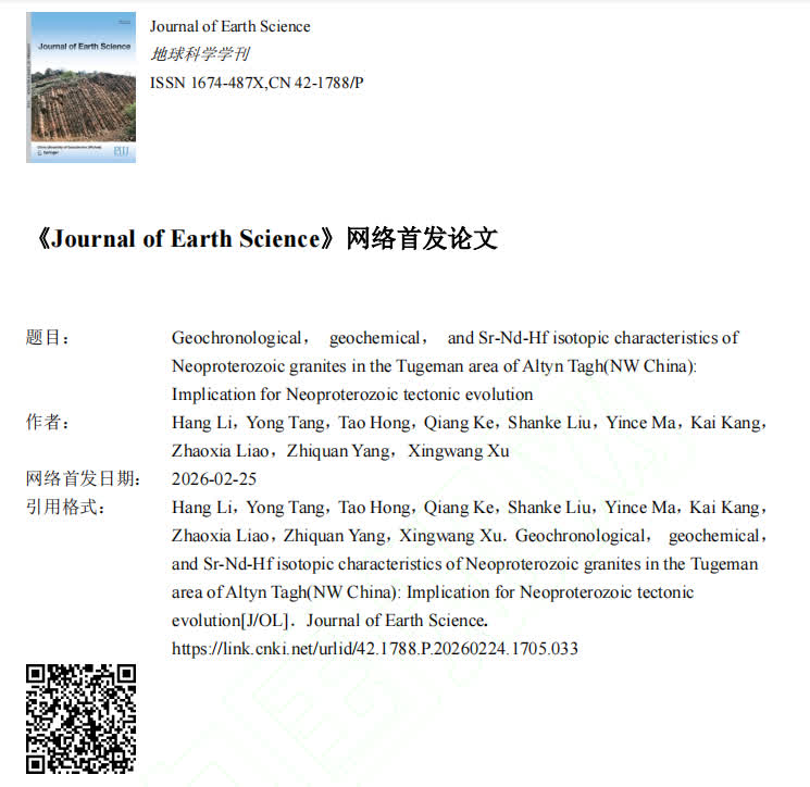 据悉,《Journal of Earth Science》为中科院地球科学大类一区 TOP 期刊,JCR Q1分区期刊,最新影响因子为4.7。论文地址:https://link.cnki.net/urlid/42.1788.P.20260224.1705.033。
