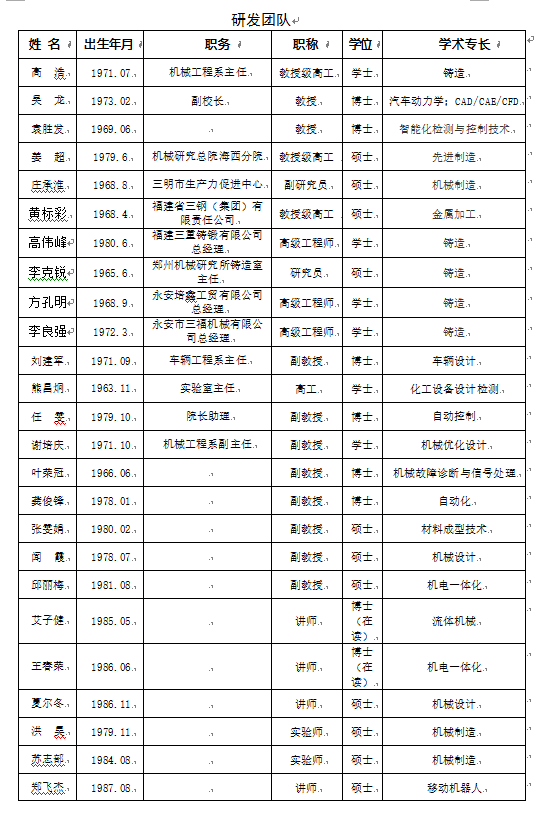 福建省铸锻零部件工程技术研究中心重点围绕海峡西岸区域发展战略需求,瞄准绿色铸锻领域重大科学技术问题和福建省绿色铸锻产业发展需求,在绿色铸锻中的关键技术--半固态金属成形技术、数字化无模铸造技术、精密冲压成形技术、精密锻造成形技术、废砂再利用技术等领域开展前瞻性研究,以三明市重点发展的冶金与压延、机械及汽车等产业集群为应用领域,包括绿色智能化铸锻设备、绿色高端冶金与压延零部件制造、绿色机械与汽车零部件制造三个方向,开展以智能化离心铸造数字化车间、水玻璃铸造废弃砂再生中试生产线、高性能汽车零部件生产线等工程化技术的推广应用与示范。充分利用已取得的气缸套离心铸造模拟、气化炉仿真模拟与结构优化、三维零部件图库二次开发、四轮驱动田园搬运管理机、精密冲压曲轴、铸造废砂回收处理等研究成果,筛选出6-8种典型零部件并完成其性能强化与检测,力争在3-5年内开发出3-5种高端零部件机械产品,同时协同各方力量开展零部件力学性能检测等相关技术服务(委托制造、合作开发、人员培训、产业咨询、技术服务等),推动三明市相关产业的转型升级和跨越式发展,助推三明市绿色铸锻及其高端零部件制造科技创新平台建设成为三明市重点、福建省有影响力的研发基地和制造服务平台。