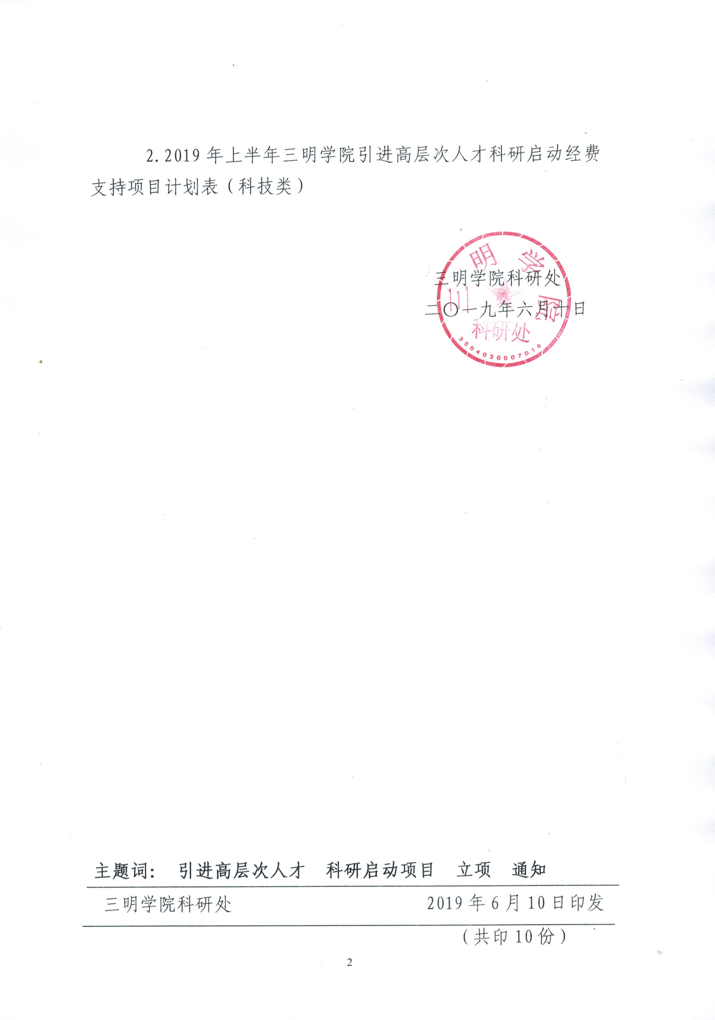 关于2019年上半年三明学院引进高层次人才科研启动项目立项的通知