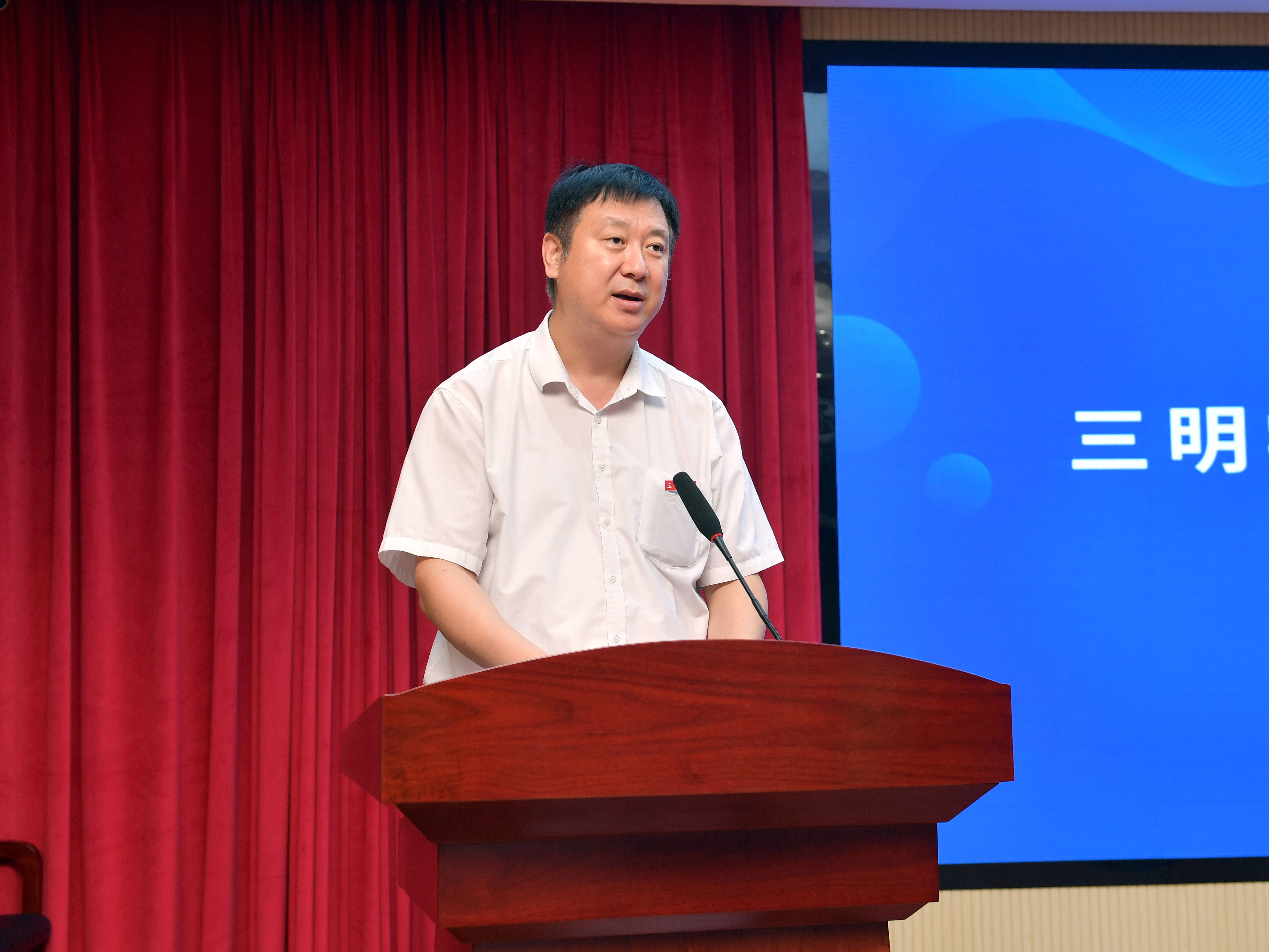 三明市科技局蔡兴山致辞,他指出,“蓝马甲”不仅仅是一个标识,更是一份沉甸甸的责任和承诺,它象征着专业、精准、高效的服务。他强调,希望三元区开展好此次行动,打造一支懂政策、通技术、善服务、接地气的“蓝马甲”服务团队。希望各位“蓝马甲”以高度的责任感和使命感,发扬务实作风,深入企业、精准服务,全面提升企业创新能力。也希望各位企业把握好此次“蓝马甲”服务专项行动,积极参与、坦诚交流,让“蓝马甲”们服务更精准、帮扶更到位。