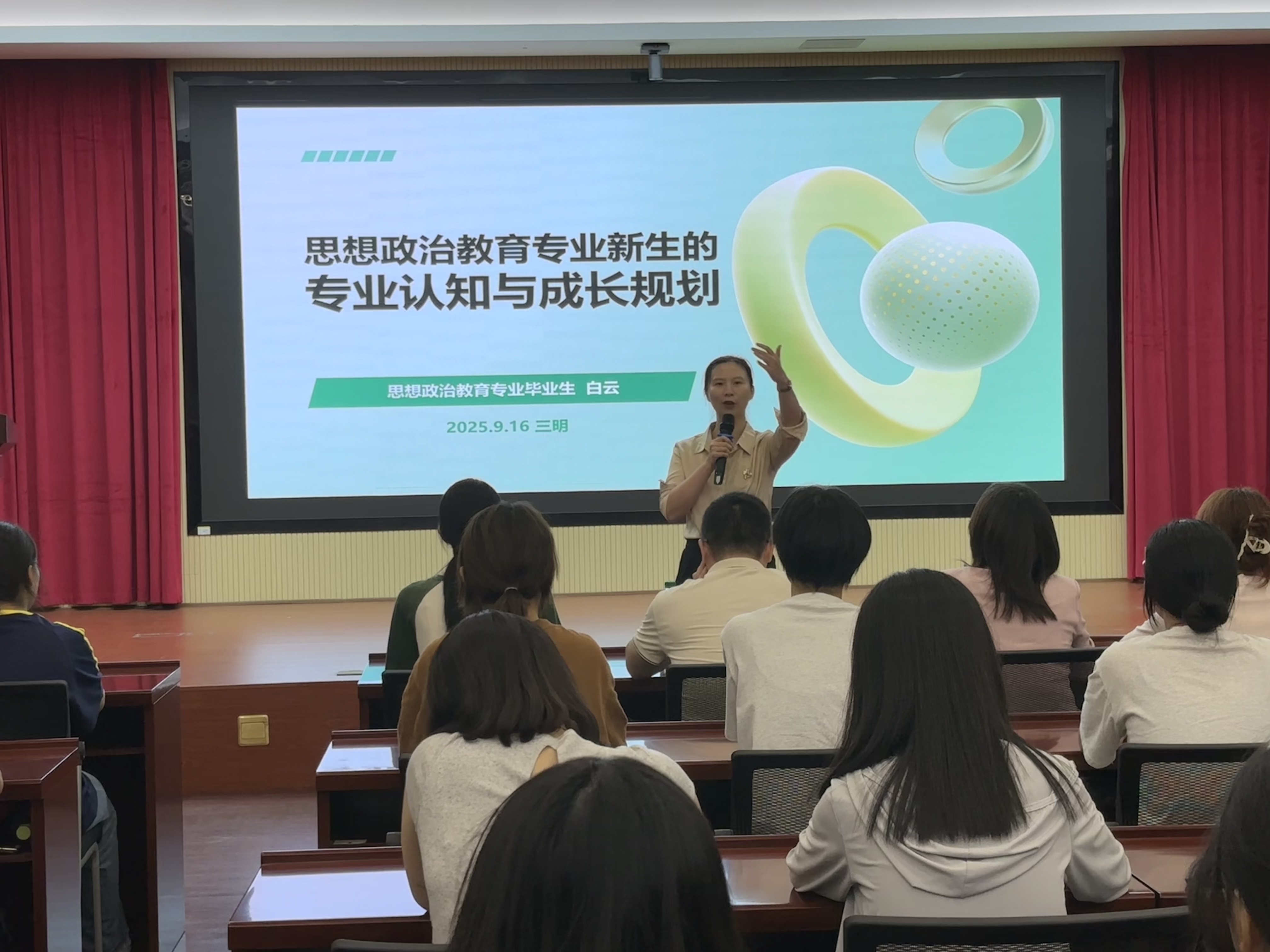 为帮助思想政治教育2025级新生快速建立专业认知,规划大学成长路径,9月16日晚,学院邀请省普教室思想政治学科教研员白云老师到校授课,为新生们带来《思想政治教育新生的专业认知与成长规划》的专题讲座,用亲身经历为新生拨开专业迷雾,注入成长动力。
