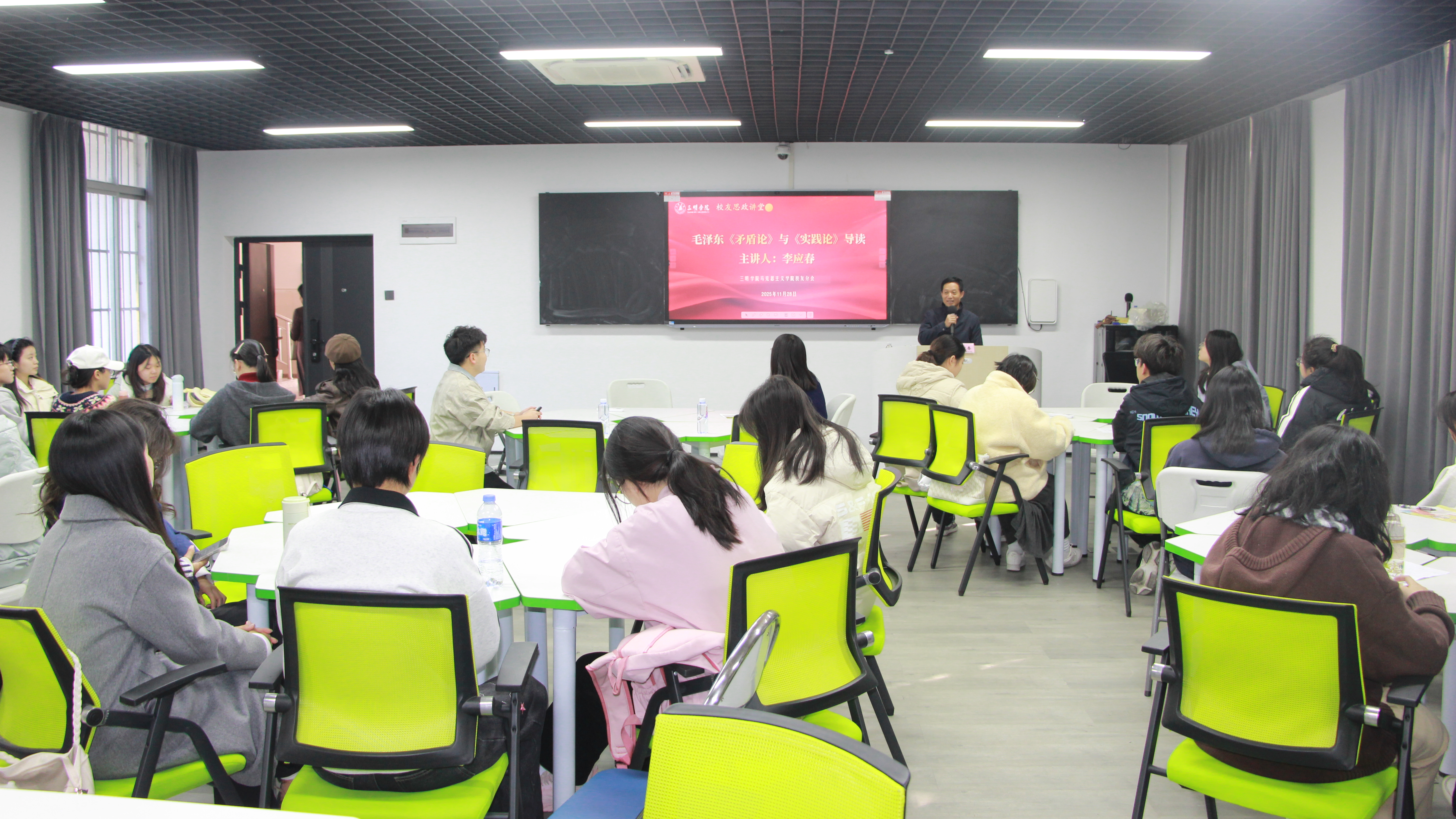 为深入学习贯彻党的二十届四中全会精神,帮助青年学子从党的经典文献中汲取担当中国式现代化建设的智慧和力量。11月28日上午,三明学院马克思主义学院校友分会邀请李应春教授为马克思主义理论读书社全体师生开讲名为《毛泽东〈矛盾论〉与〈实践论〉导读》的校友思政讲堂。活动在明德楼二智慧教室举行,师生们积极参与,现场气氛热烈。