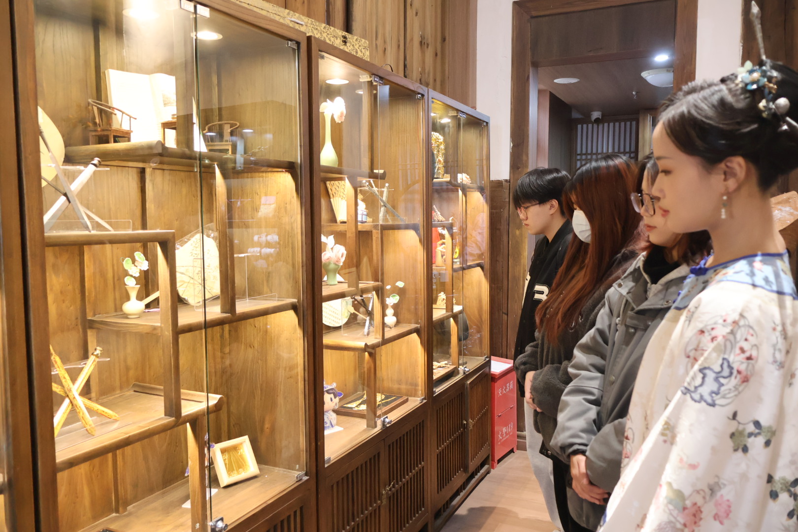 团队深入福州三坊七巷历史文化街区,开展调研与传播相结合的实践活动拜访长期致力于本土民俗器物收藏与研究的“兮有物”古董空间,通过观摩大量明清至民国时期的民间藏品,补充了文献记载之外的地域特色与流传故事,丰富了三条簪的民间叙事谱系。三坊七巷的青石板路上,团队带着调研成果走向公众,通过实物展示、现场讲解与互动交流,向市民游客生动讲述三条簪的历史渊源、工艺特色与文化内涵,让这项承载闽都记忆的非遗技艺走进大众视野。一位外地游客在听完介绍后表示:“原本只是来逛古街拍照,没想到还了一堂生动的文化课