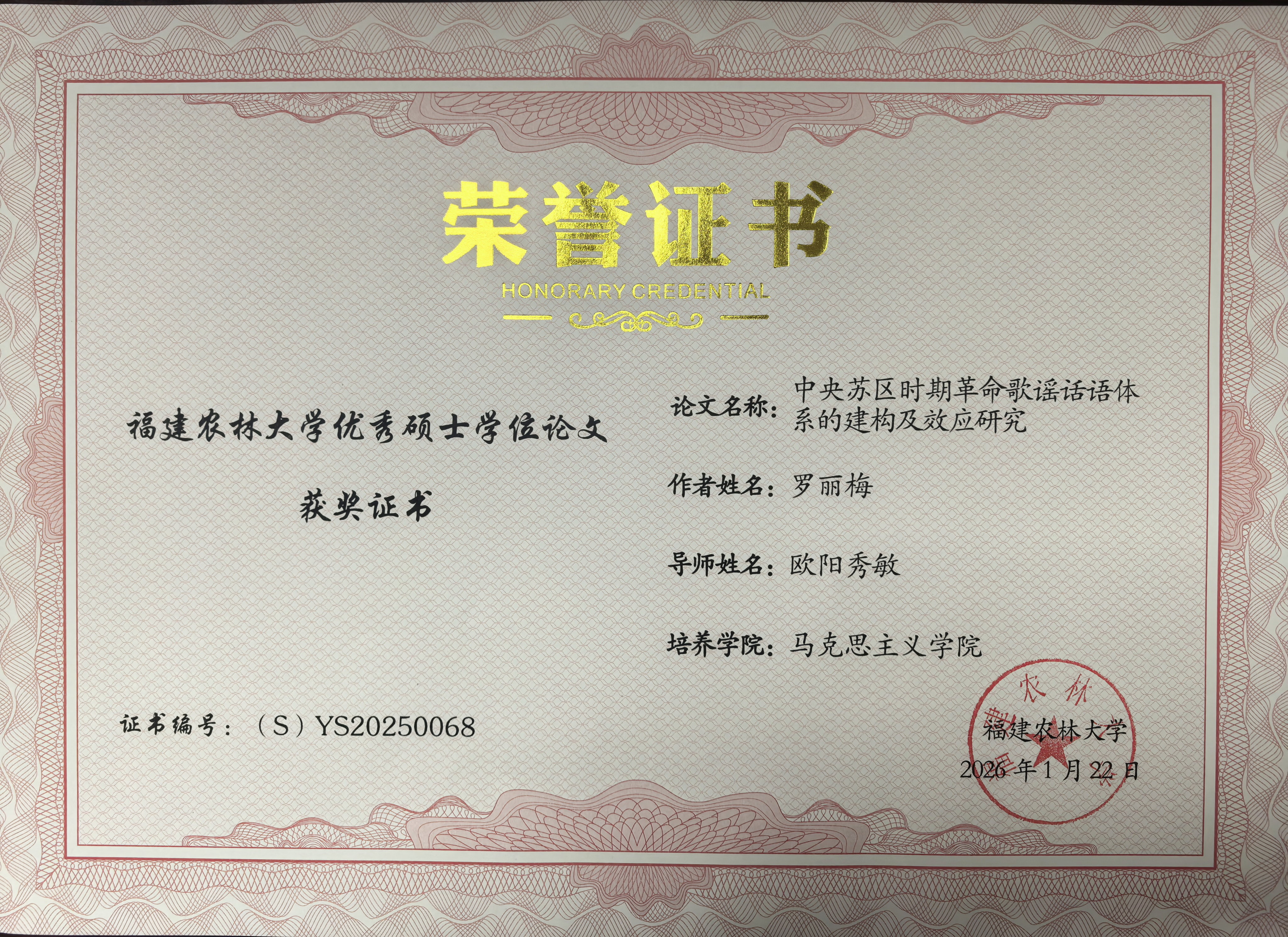 近日,三明学院马克思主义学院与福建农林大学马克思主义学院联合培养研究生罗丽梅的硕士学位论文《中央苏区时期革命歌谣话语体系的建构及效应研究》获评福建农林大学2024年优秀硕士学位论文。据悉,罗丽梅同学是本年度福建农林大学马克思主义学院唯一获此荣誉的研究生。该论文的指导教师为欧阳秀敏教授。