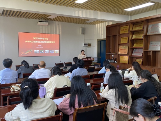 4月1日,学院党委组织全体党员集中学习。第一支部书记石雪梅老师以“学习习近平总书记关于树立和践行正确政绩观重要论述”为题讲授专题党课,重点领学第二、第三、第四章内容。