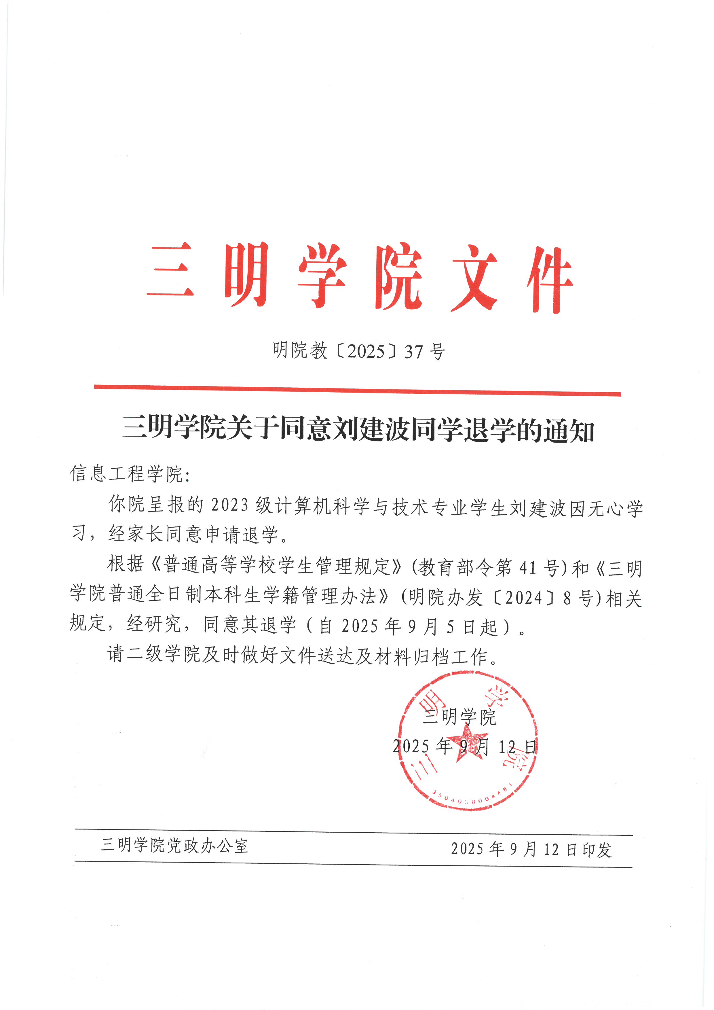 37-三明学院关于同意刘建波同学退学的通知