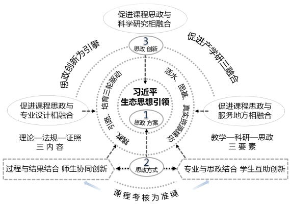 思政内容紧盯环保前沿。以环保最新技术引领课程变革,自编教学讲义案例,不断挖掘提练“生态、共享、爱国、敬业”等思政元素,形成“点—线—面”结合的思政教学方式,多阶度推动立德树人与环评需求的紧密衔接。