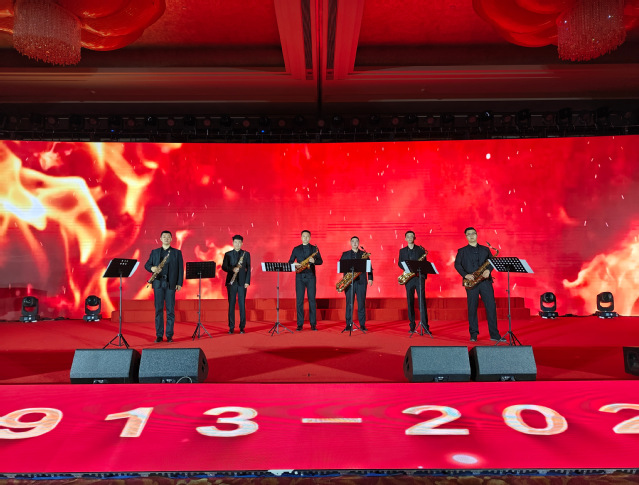 10月20日晚,欧美同学会成立110周年联欢晚会在北京饭店国际会展中心北京宫举行。福建欧美同学会三明分会副会长、三明学院教育与音乐学院梁思宇受邀参加晚会。图为梁思宇(左三)作为主演参与合奏萨克斯管重奏节目——《火焰之舞》。