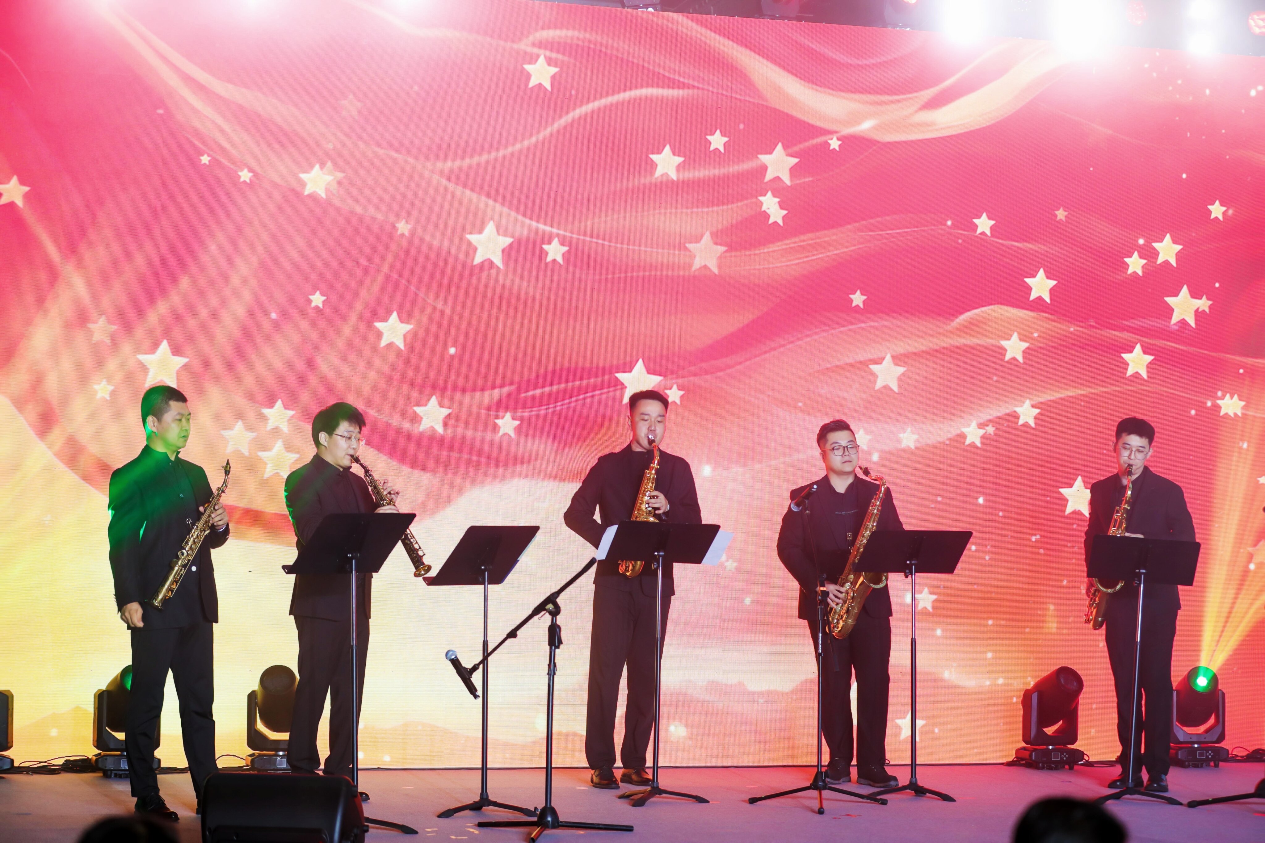庆祝活动以“赓续报国志 聚力启新程”为主题,图为梁思宇(左三)作为主演参与合奏萨克斯管重奏节目——《火焰之舞》。