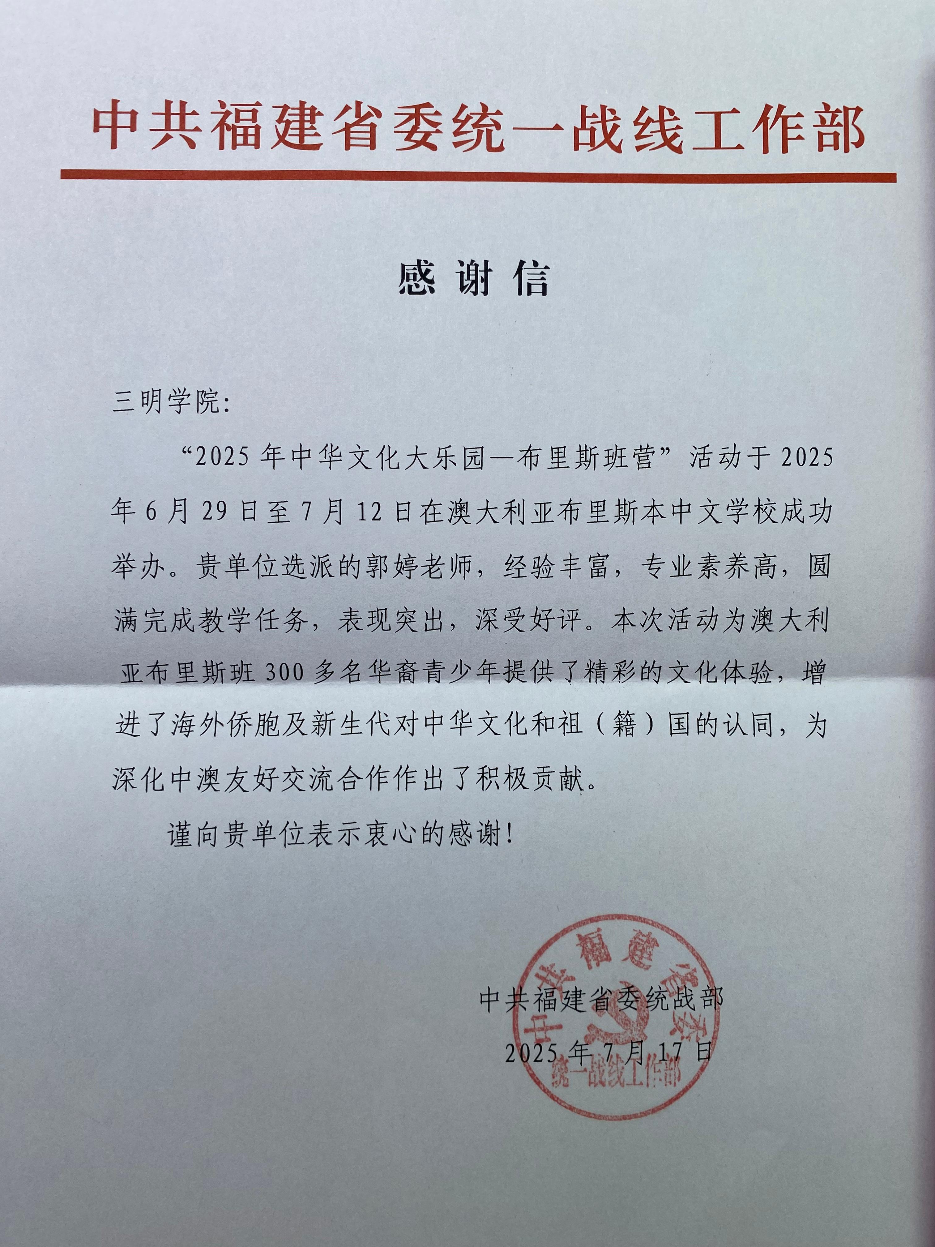 近日,中共福建省委统战部向三明学院发来感谢信,感谢我校郭婷老师在“2025年中华文化大乐园一布里斯班营”活动中作出的突出贡献。
