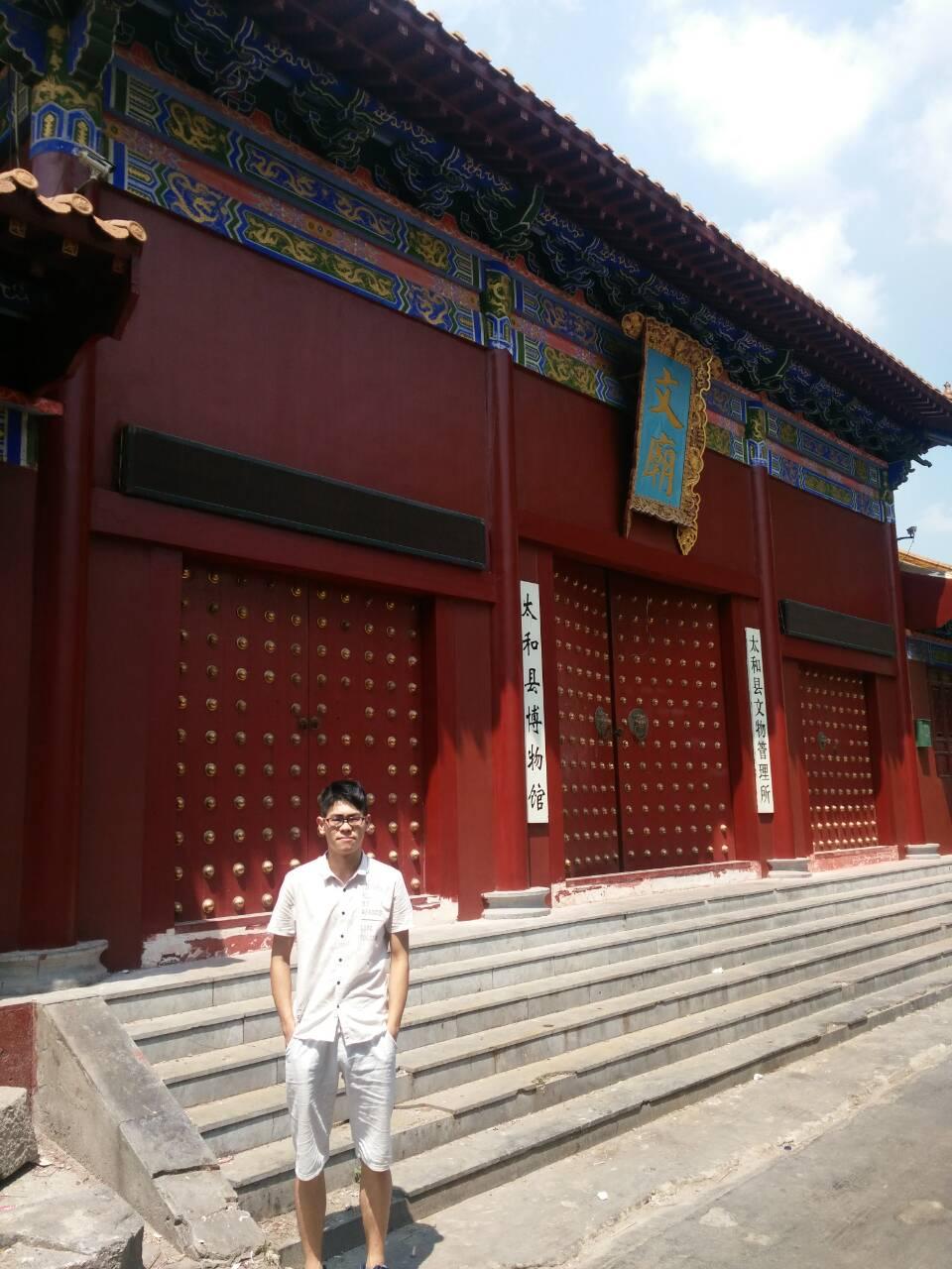 7月20日至21日,2015级传播学的侯林辉同学来到了安徽太和县的文庙,开始了对文庙的参观与了解。他把孔庙的文化和社会主义核心价值观体系要求结合起来,总体了解了安徽文庙概况,在文庙对于文化影响的区域性、独特性和文庙保护的现代意义等方面进行分析,充分发挥文庙的文化传承带动功能,从而使文化资源的价值焕发出新的活力,进而推动文化强省的进一步发展。在工作人员的带领下,侯林辉同学参观了南北方向的名宦祠、乡贤祠、大成殿、明伦堂、尊经阁、东侧的兴贤坊、文昌阁、训导宅、进德斋、崇圣祠以及西侧的育才坊、修业斋等。这让侯林辉同学感受到这些建筑物带来的浓厚的儒家文化气息,以及古代莘莘学子勤劳学习的良好风气。并以问卷调查的方式,了解到了游客对于当前通过文庙弘扬儒家文化的看法和文庙在当代的教育作用。