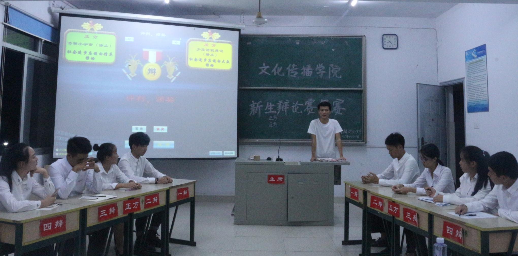 10月21日晚19点,鸿文楼202、302和404教室内气氛火热,由文化传播学院一言辩论协会主办的新生辩论赛复赛在此如火如荼的进行。本次比赛围绕 “推动社会进步的是大众还是精英”这个辩题展开,参加比赛的六只队伍分别来自传播班和播音与主持班。