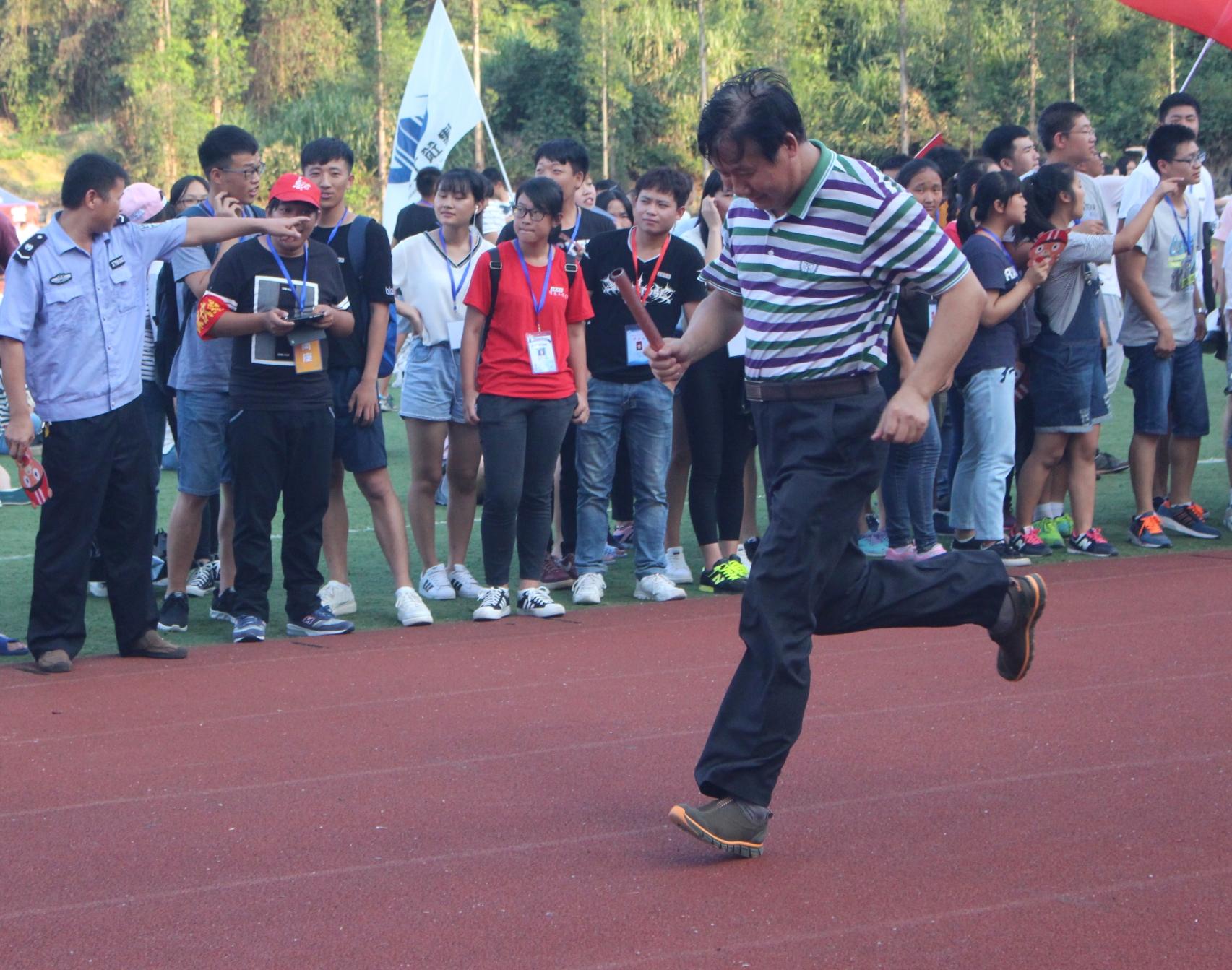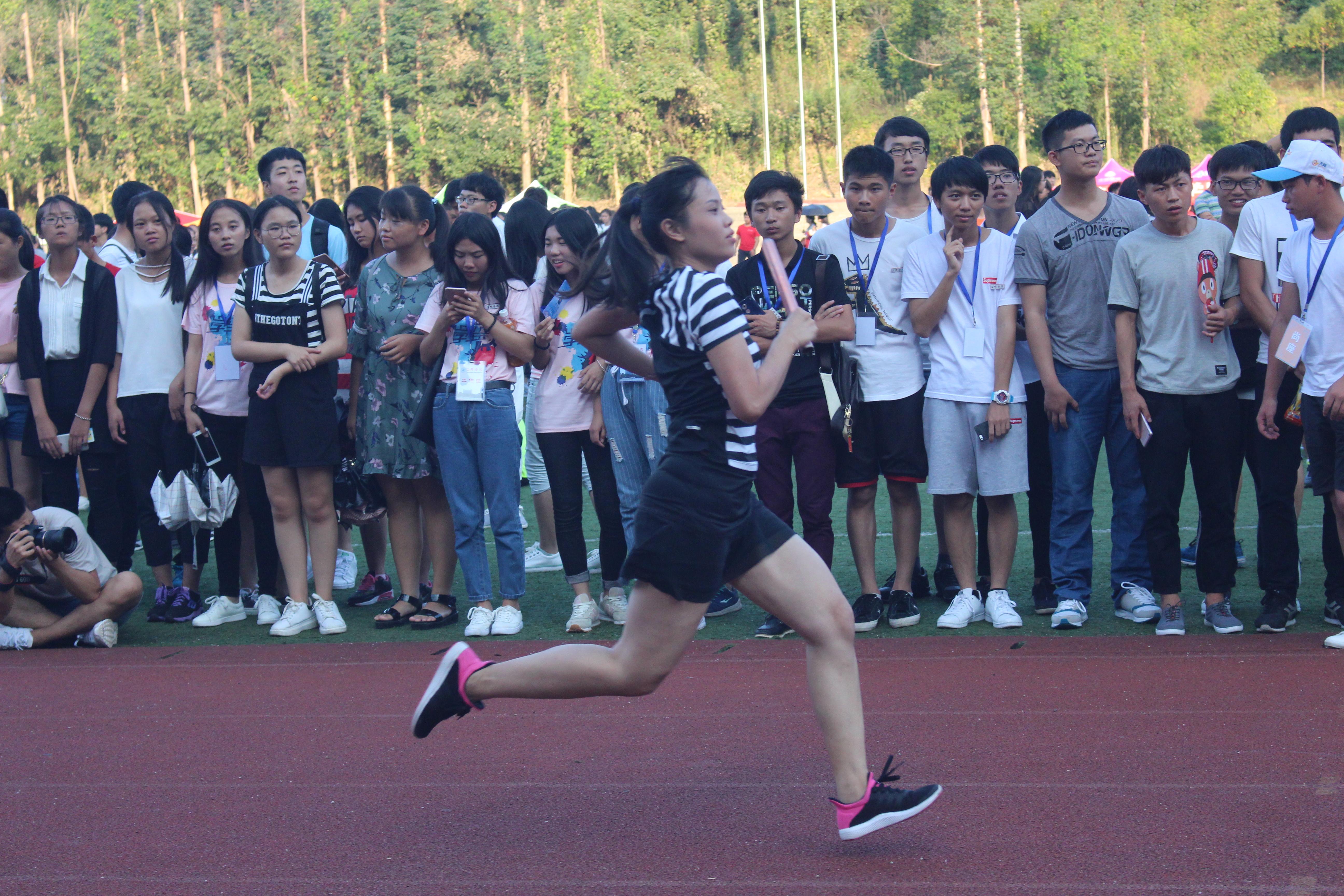 全体老师以院系为单位展开了激烈的角逐,每个院的老师们分成两队,站在五十米跑道的起点和终点,进行单向接力。文化传播学院的老师们认真热身,为接下来的比赛做好了充足的准备。枪声一响,比赛正式开始。老师们如离弦之箭,手握交接棒飞快冲出,向五十米外的队员跑去。老师们互相鼓励、互相帮助,发扬了团结协作的精神风貌,将运动会气氛推向高潮。场外的同学们热情高涨,一位同学挥舞着印有“文化传播学院”字样的大旗,剩下的同学们拼尽全力呐喊“文传加油”,老师们也用自己的行动回应着同学们,整个赛场沸腾起来。运动场上不时响起一阵阵加油呐喊的笑声与掌声,每个老师的脸上都写满了喜悦和幸福。