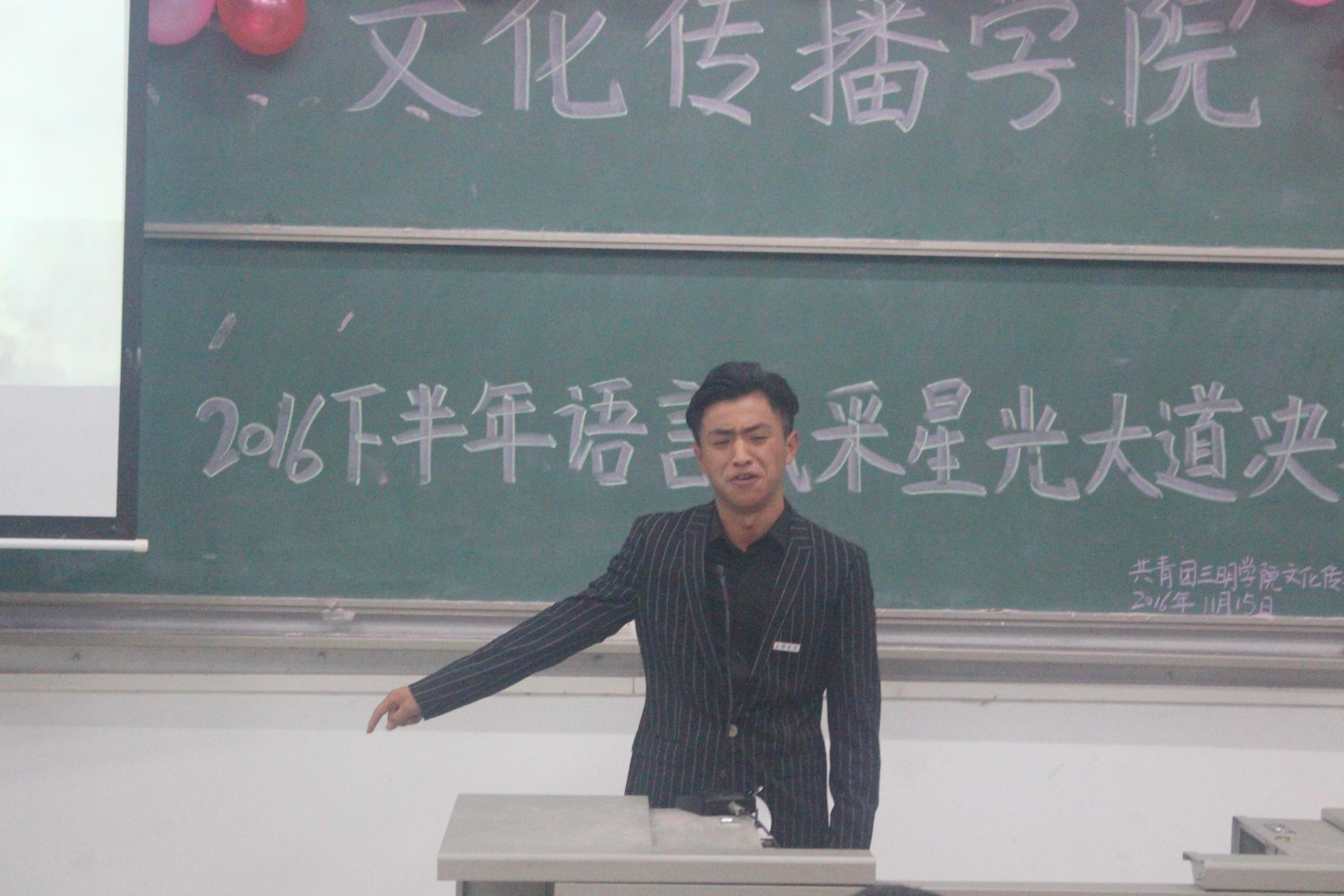 11月15日晚19:30,三明学院2016年下半年语言风采大赛《传承革命经典,重燃长征烈焰》决赛在鸿文楼201正式拉开帷幕。此次决赛有幸邀请到文化传播学院靳阳春老师、安春燕老师、金雷磊老师作为评委出席本次比赛。按照惯例,本次比赛分为专业组与非专业组,两组的选手都以朝气蓬勃的精神风貌参加此次比赛。