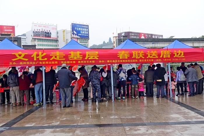春联,作为具有中国文化特色的艺术形式近年来渐渐被印刷产品所替代,为进一步发扬这一传统文化,宣传我国的传统书法艺术魅力,在2017年1月15日上午9:30-11:30,由泉州市文化广电新闻出版局、海峡都市报、泉州市艺术馆主办,德化县文化体育新闻出版社、德化县文化馆协办的“文化走基层,春联送厝边”活动在德化县瓷都广场顺利开展。