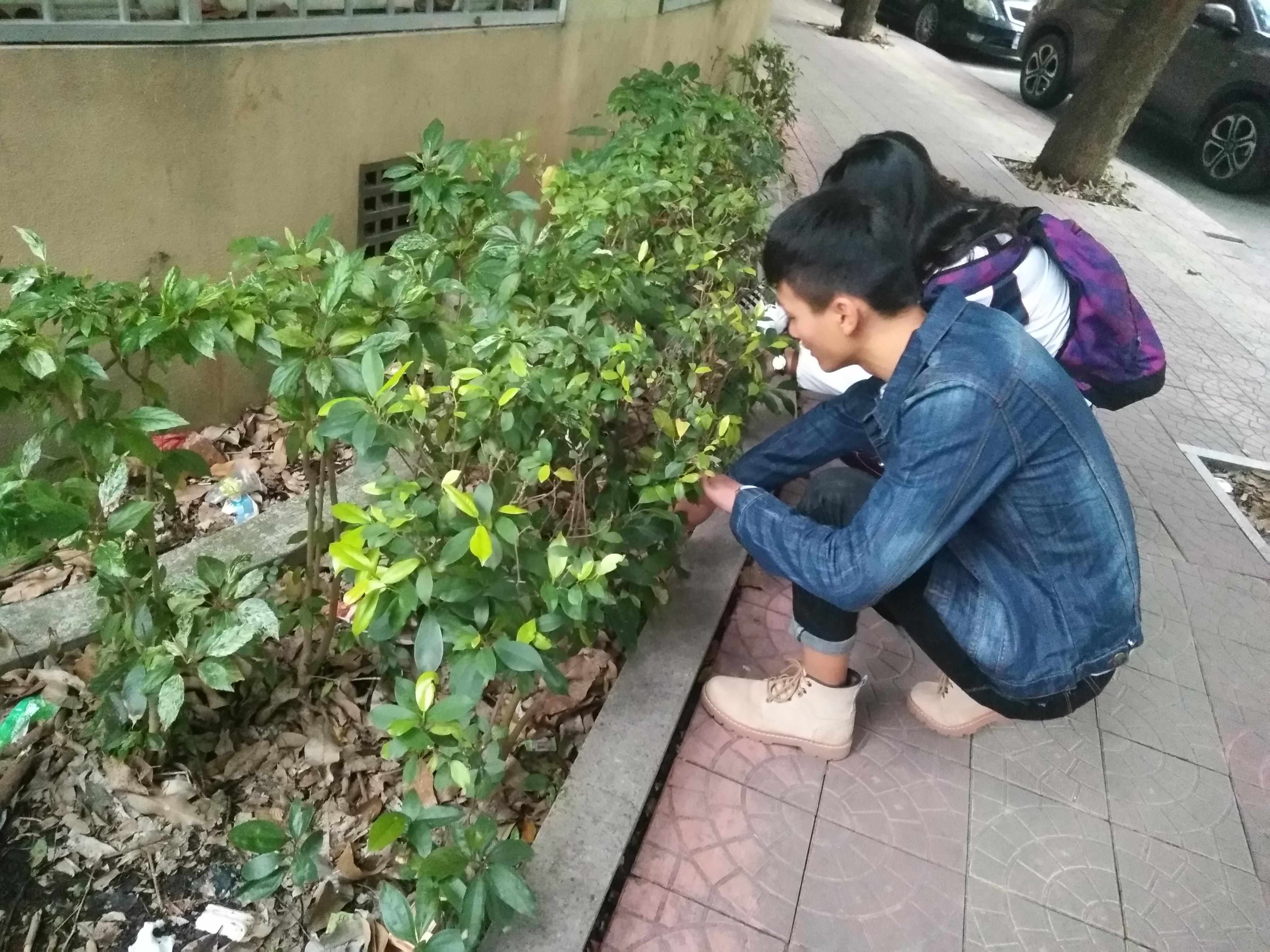 来到街道的陈炯桦同学与伙伴们发现,街道的卫生较为干净,但是街道周围的灌木丛内垃圾多且难清理,街上的行人较多,时常有行人往灌木丛内丢弃体积较小或难分解的垃圾的现象。
