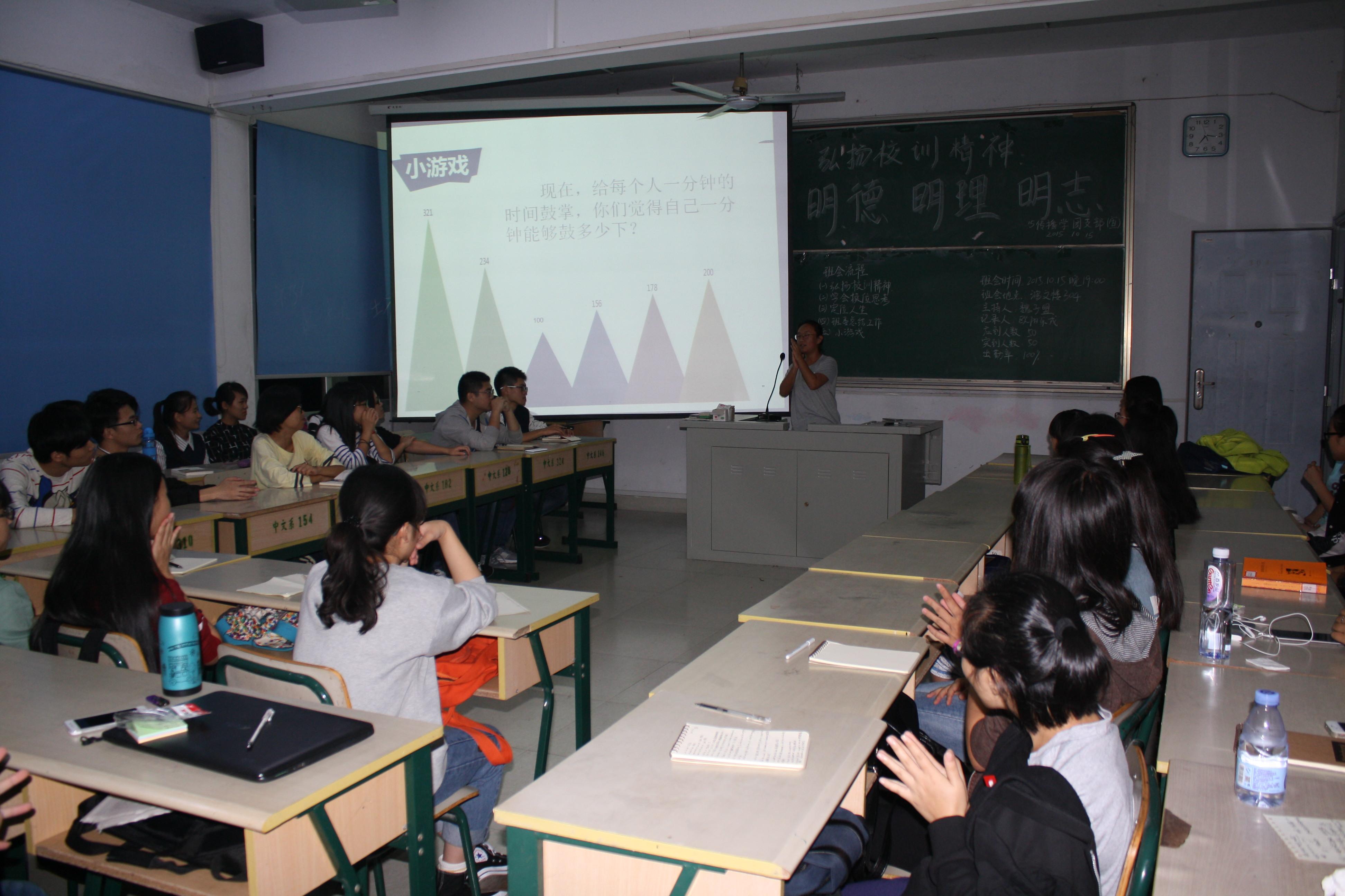 作为初入大学的一员,学习新校训,弘扬校训精神成为每一个新生的责任。10月15日晚七点,文化传播学院2015级的同学终于迎来了开学第一次以“弘扬校训精神,明德明理明志”为主题的班会。