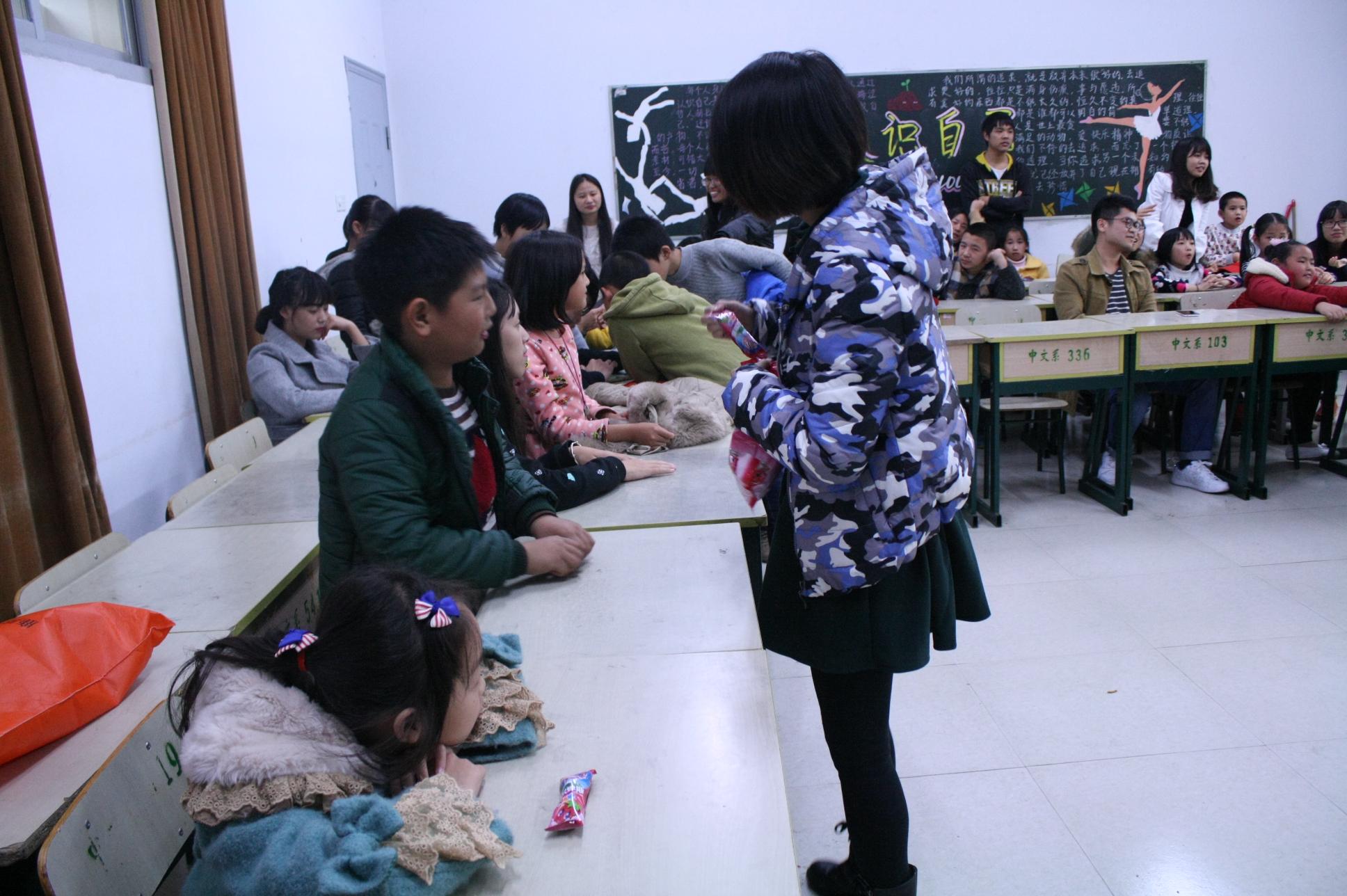 寒冬腊月,情满校园。文化传播学院青年志愿者们到荆东小学,带领学生们来到鸿文楼204教室,一起度过了一个丰富有趣的周末。教室里尽是志愿者们和小学生们互动的身影。志愿者们认真地对孩子们进行了功课辅导。除此之外,他们还带领学生们玩游戏。击鼓传花、爱的抱抱和贴鼻子比赛是此项活动中较有趣的环节。其中,在“击鼓传花”环节中,孩子们积极踊跃,以智慧赢得了一个又一个的奖品,他们的脸上亦洋溢着满足幸福的笑容。最后,志愿者们和孩子们拍照合影,记录了这难忘的时刻。