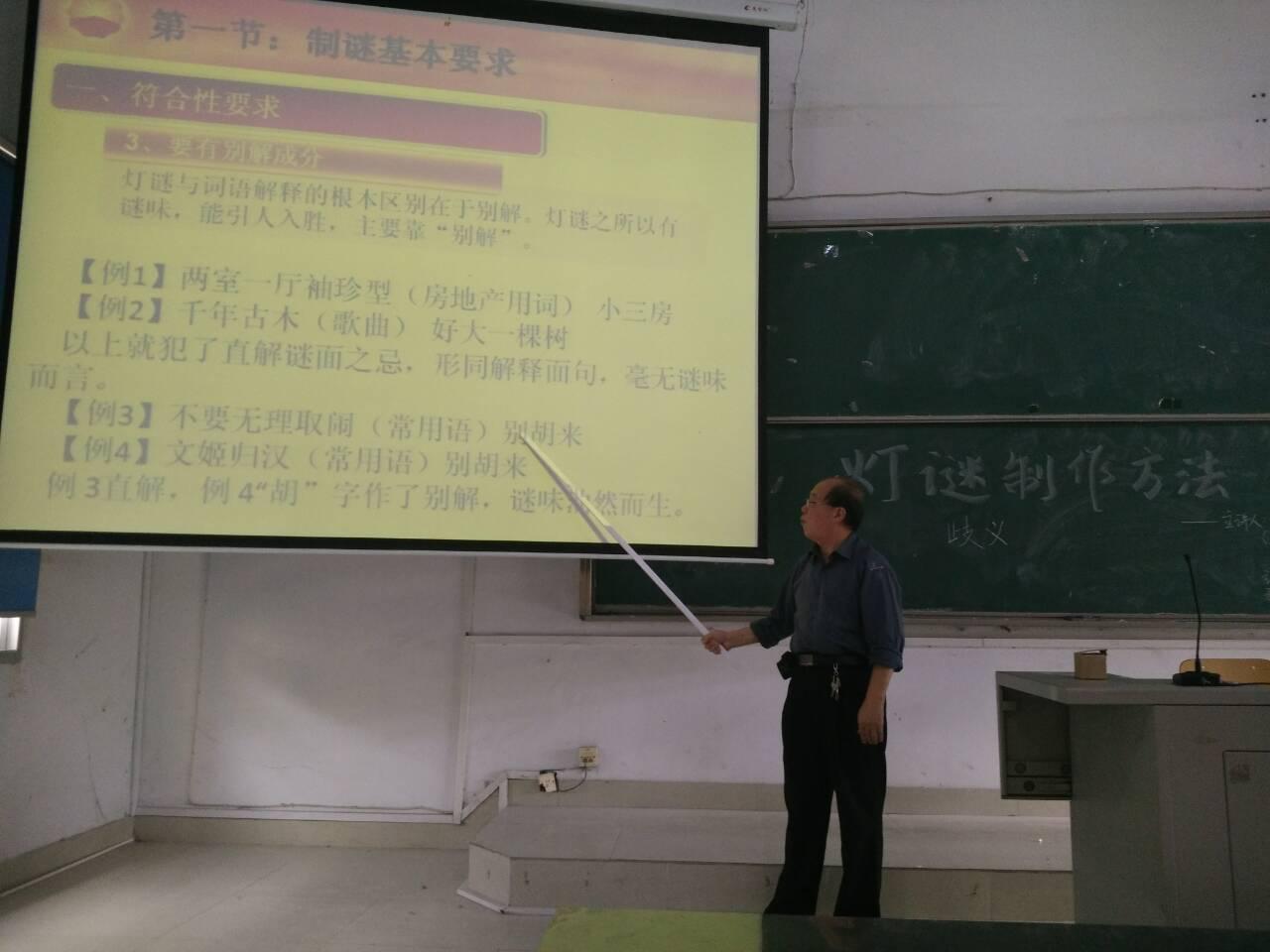 为了提高在校大学生对灯谜的认识,更好的传承灯谜艺术,4月20日下午文化传播学院特邀三明市灯谜协会会长陈国迁先生在鸿文楼201教室为同学们开展了主题为“灯谜制作方法”的专题讲座。本次讲座由文化传播学院灯谜协会主办,文化传播学院易班工作站承办。