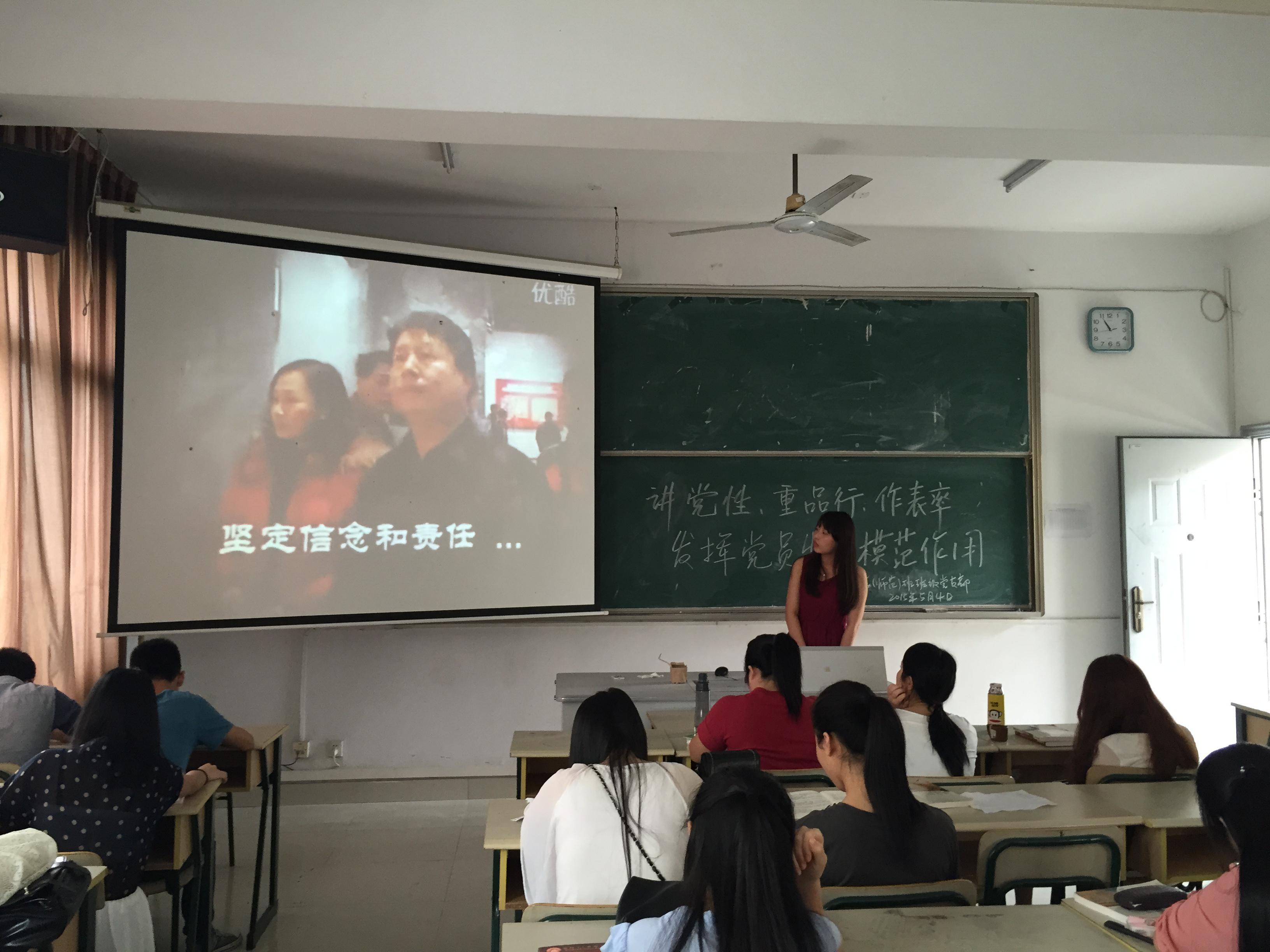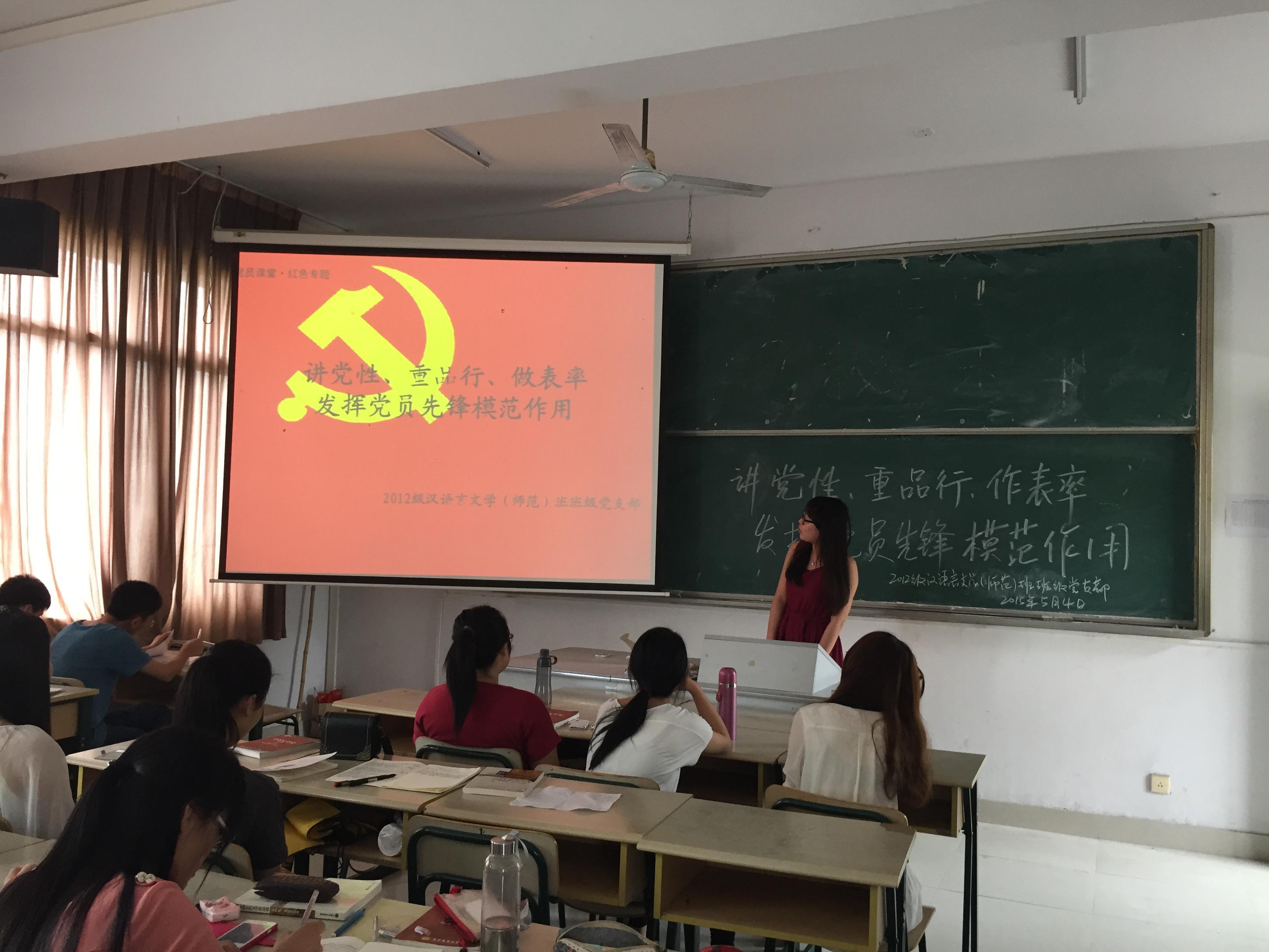 为丰富班级党支部的党内生活,提升班级党支部的凝聚力,加强对党的理论知识学习,2015年5月4日,文化传播学院2012级汉语言文学(师范)班班级党支部于鸿文楼302教室开展了一场关于红色专题的党员课堂活动。2012级汉语言文学(师范)全体学生参加了此次活动。