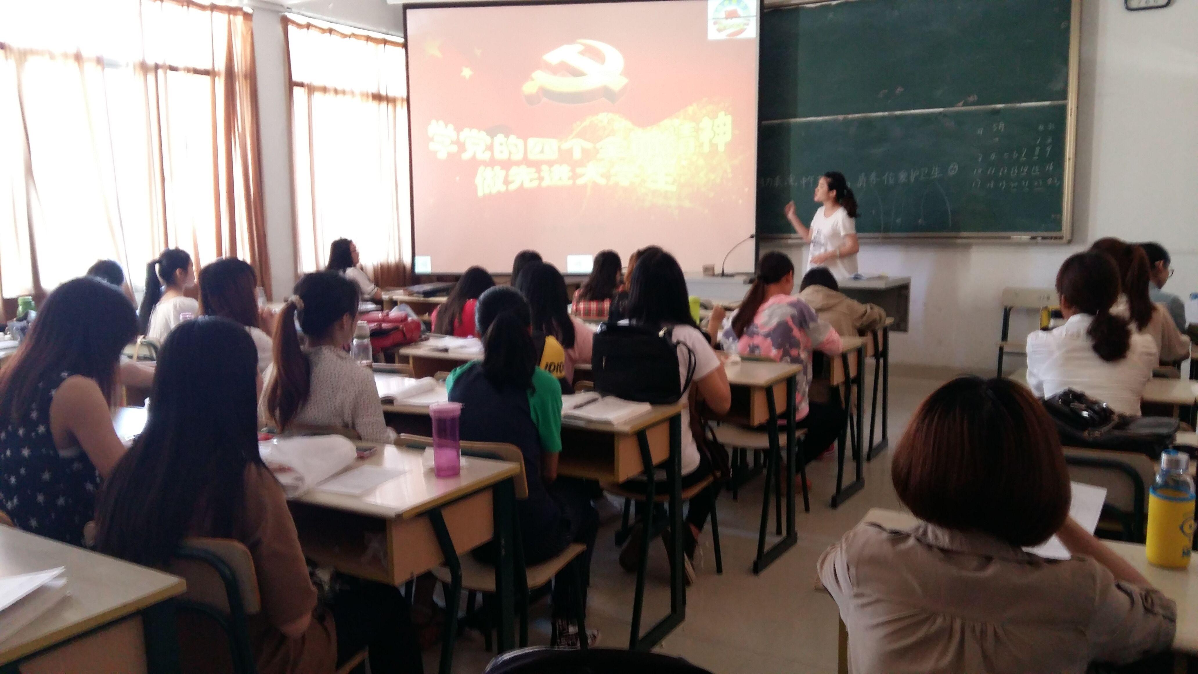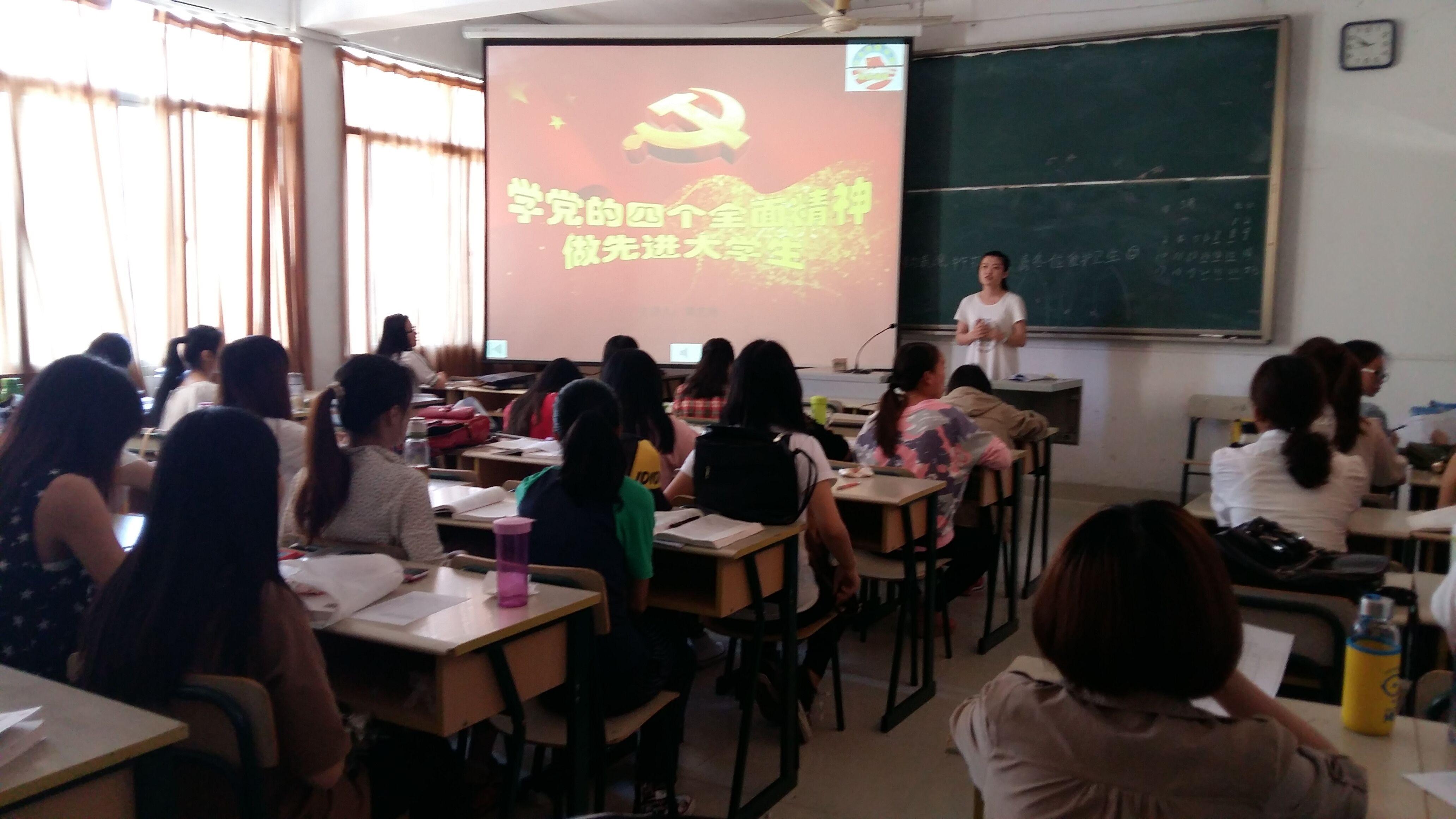 2015年5月8日晚8点,文化传播学院12级新闻1班班级党支部在鸿文楼303开展了主题为“学党的‘四个全面’精神,做先进大学生”的红色专题课堂。本次红色课堂的主讲人是该班级党支部书记黄艺玲,课堂上共有该班级党支部的4名正式党员、3名预备党员及班上所有同学参与其中。