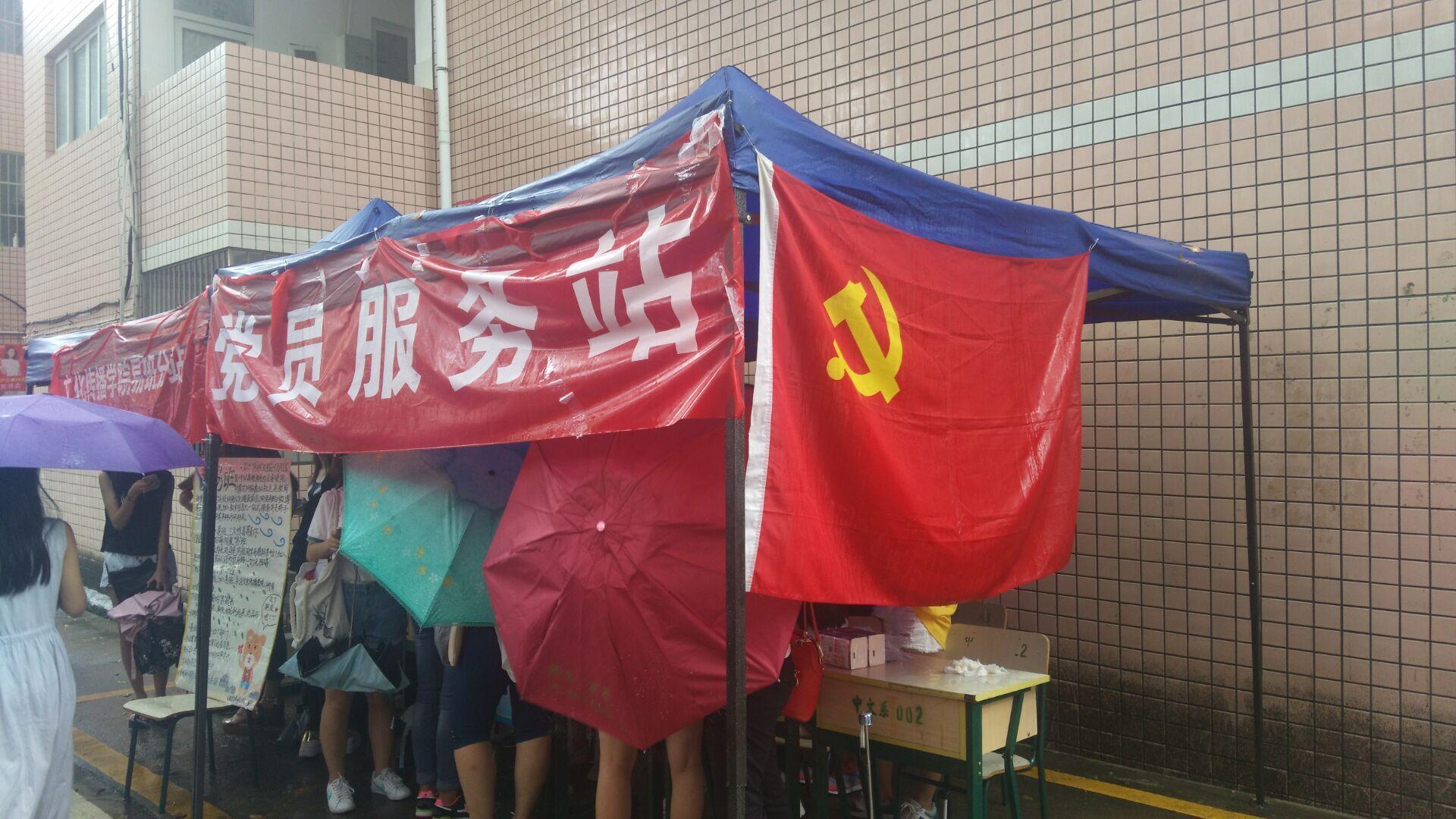 秋风过耳,桂丹飘香。又是一年迎新时。9月10日,我校迎来了2016级新生。为做好迎新工作,文化传播学院在学校各处安排人员引导。各班小导、学生会志愿者以及党建办公室的成员们纷纷加入迎接新生的行动中去。 早上开始,天空就飘起了雨。淅淅沥沥的雨并没有影响志愿者的热情和入学新生的兴奋,报名点一片喧嚣。党建办公室的成员早早的来到报道处,搭建帐篷、悬挂横幅和党旗。成员们主动帮助新生提行李、为他们指路,怀着满腔热忱帮助家长和新生答疑解难,耐心地向前来咨询的新生介绍有关党的知识以及入党程序。午后,雨停了天空也渐渐晴朗起来。下午报道的新生虽有减少,迎新志愿者的热情却丝毫不减。党建办公室的成员们依然坚守岗位,随时准备为新生提供帮助,让刚踏入校园的新生们感受到不一样的温暖。