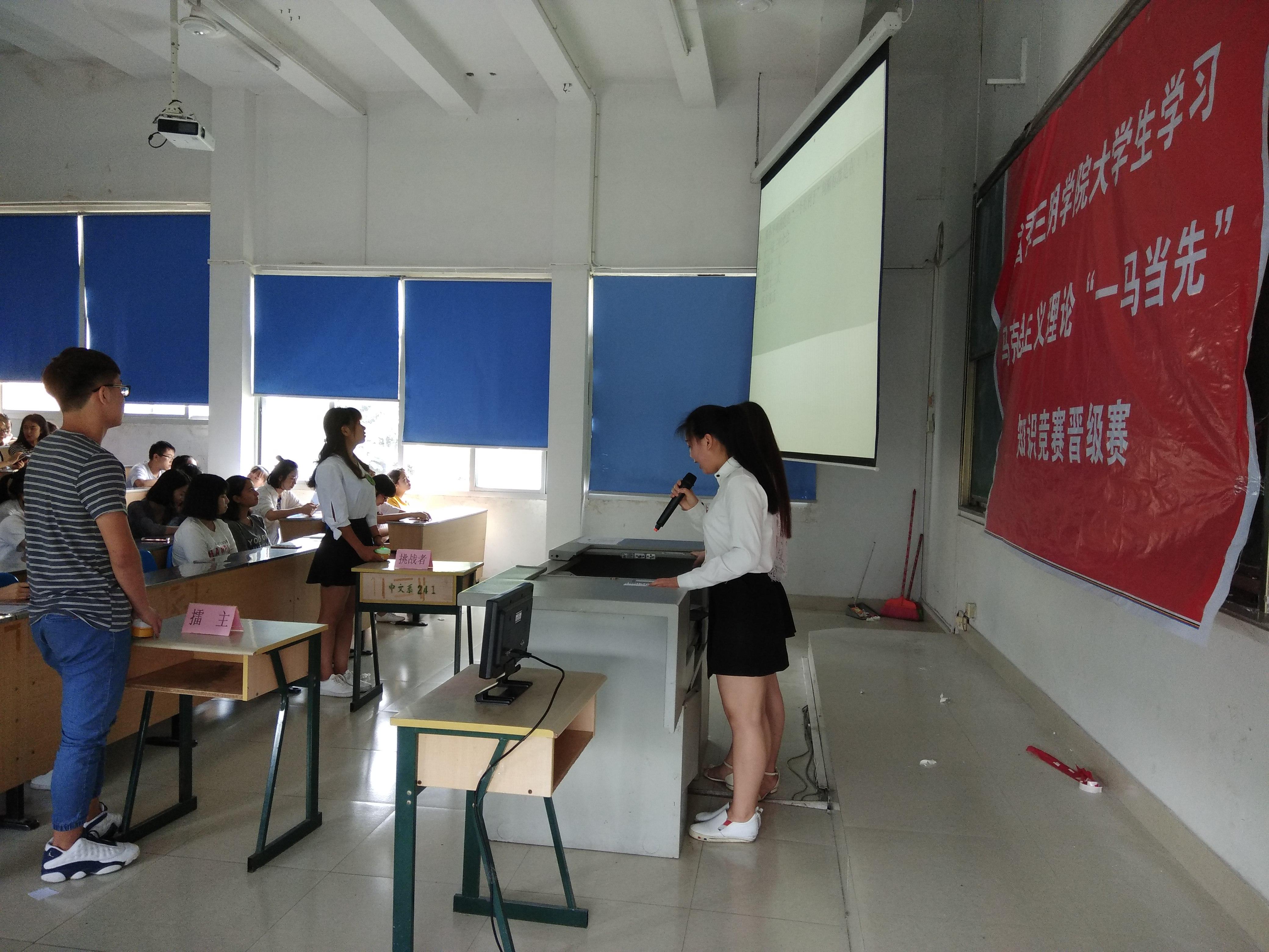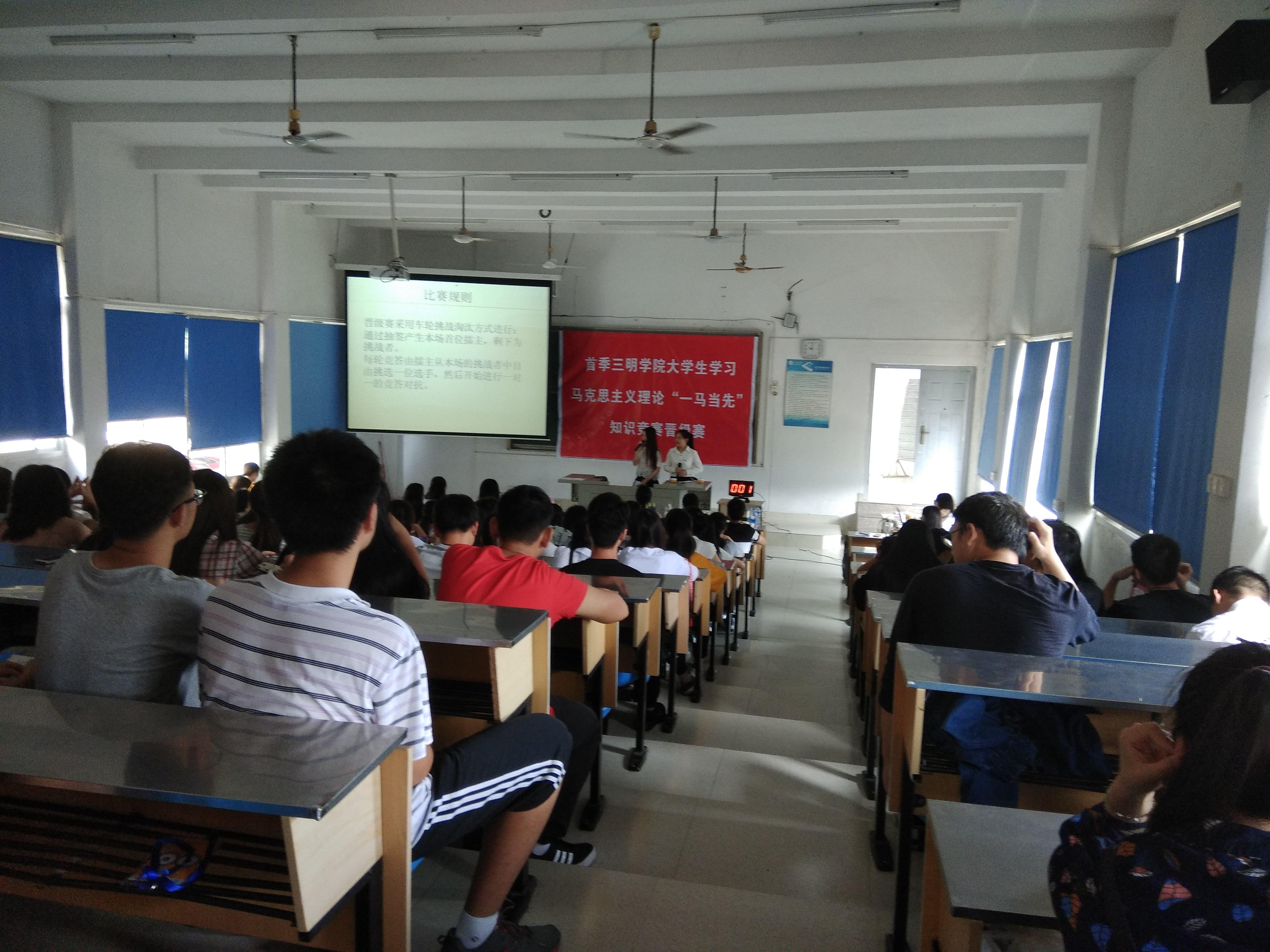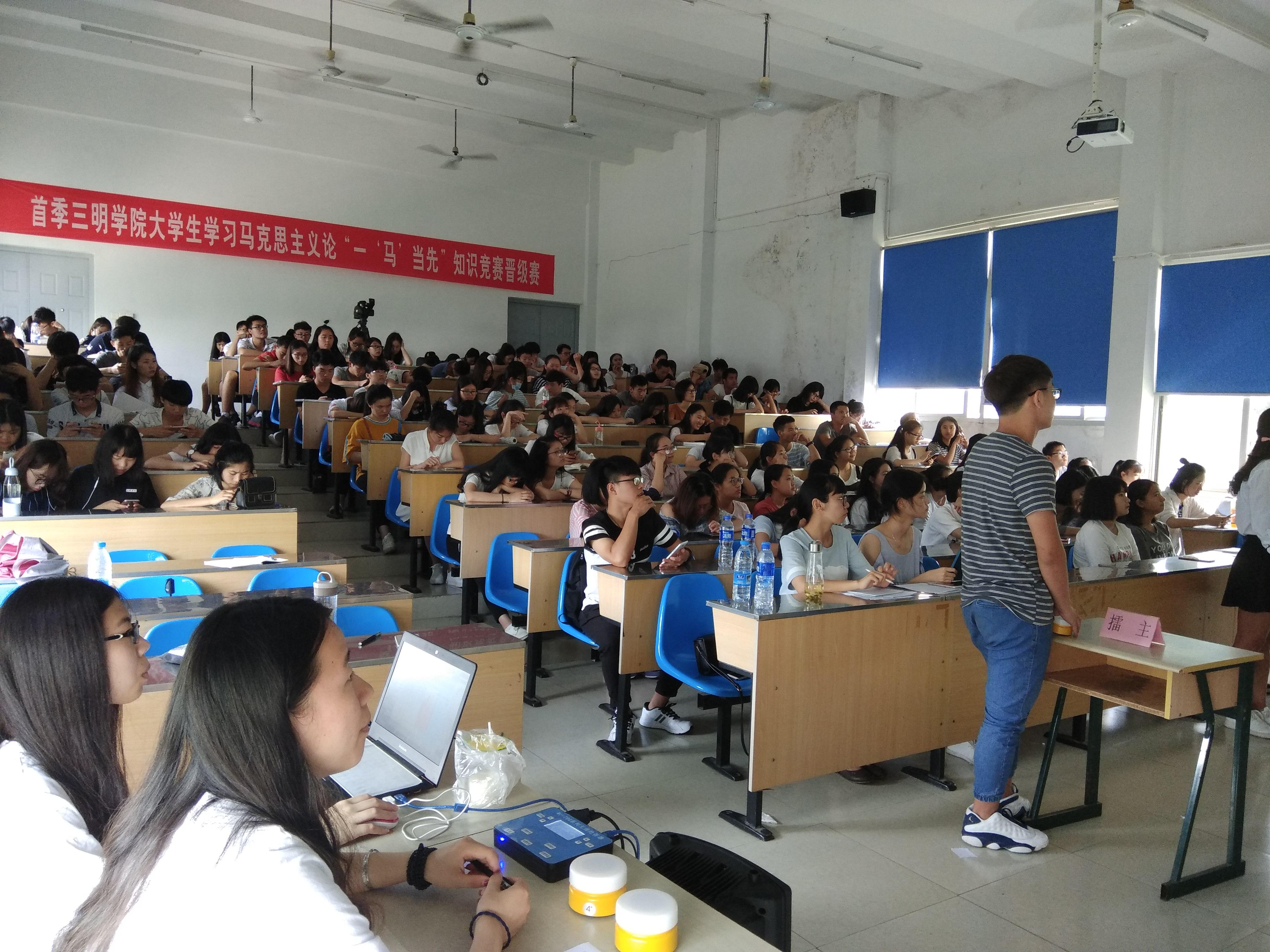 由学工部、校团委、马克思主义学院主办,文化传播学院学生党建工作室、青年马克思主义协会承办的首季三明学院大学生学习马克思主义理论“一马当先”知识竞赛晋级赛6月3号早上8:30在鸿文楼201举办,时间历时两天。学工处处长秦玮老师、副处长张衍辉老师、团委副书记叶志鹏老师和文化传播学院党务秘书刘欢老师出席了本次晋级赛。14个学院的84位选手在舞台上展示自我,显示了当代大学生学习马克思主义理论的风采。