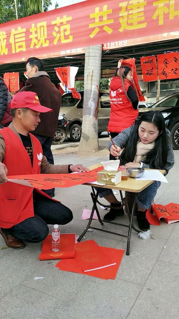 为积极响应党的十九大报告精神,同时为了更好地迎接春节。泉州市安溪县官桥镇人民政府特地组织了义务送春联活动,活动于2月6号下午在官桥镇四海明商贸一期广场进行。文化传播学院2015级汉语言文学师范班王燕腾同学受邀并成为此场活动的’“小书法家”。