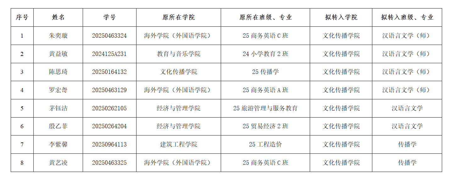 根据教务处《关于开展2025-2065学年第1学期转专业工作的通知》,我院制定《文化传播学院2025-2026学年第1学期转专业工作方案》,经学生自愿报名、学院审核、党政联席会讨论通过,现将名单公示如下: