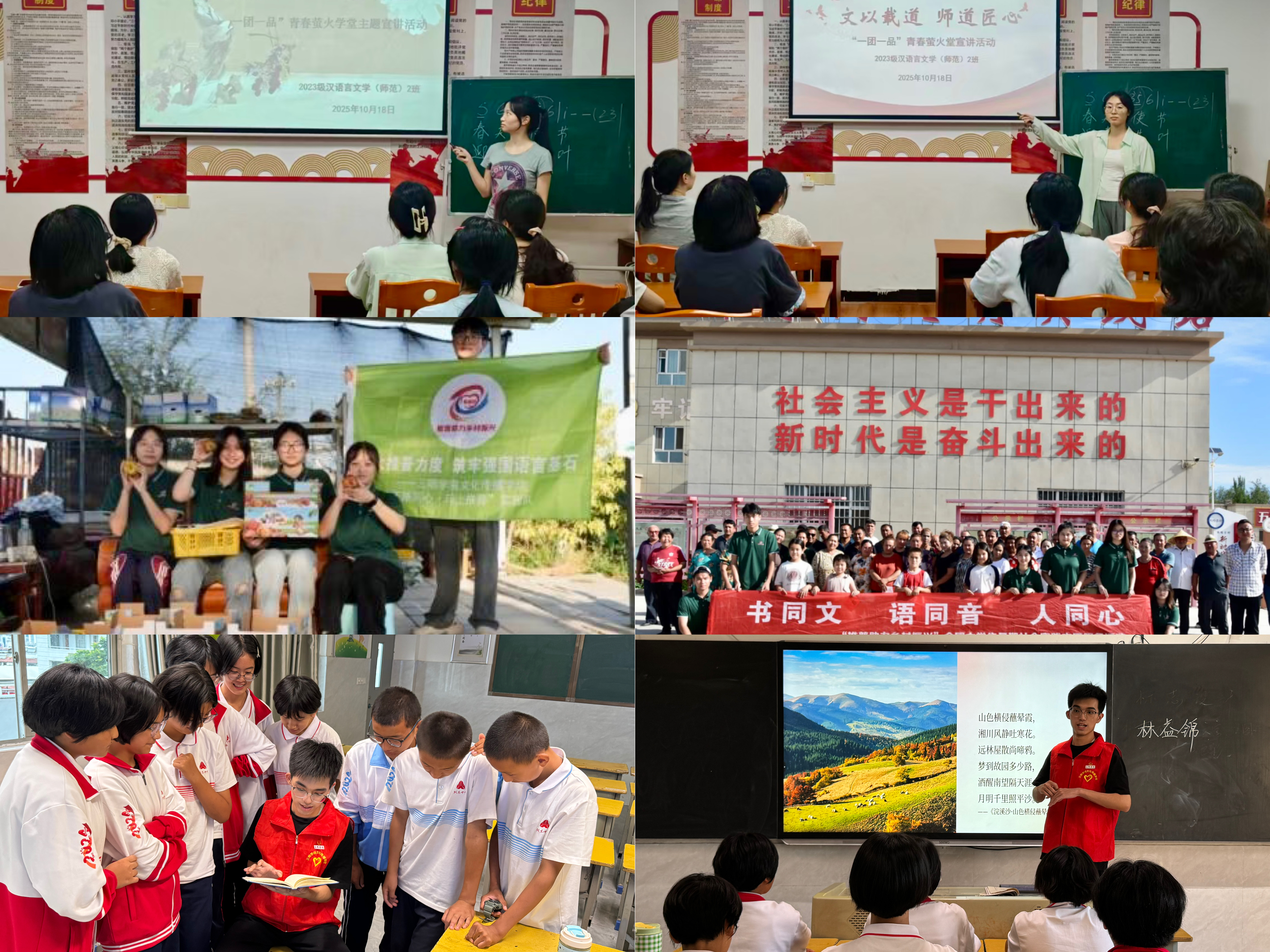 这份服务的热情,更延伸至远方。今年暑假,团支部徐子涵、林益锦所在的团队入选2025年“推普助力乡村振兴”全国大学生社会实践重点团队,赴新疆开展为期一周的社会实践,产出征文、调研报告等8项成果,获中国日报、央广网等7家省级及以上主流媒体平台报道。同时,黄倩茹、陈锦雯等4名同学担任对口新疆轮台县教师国家通用语言文字能力提升在线培训助教,以“云端”相连的方式,为推普工作贡献智慧与力量。