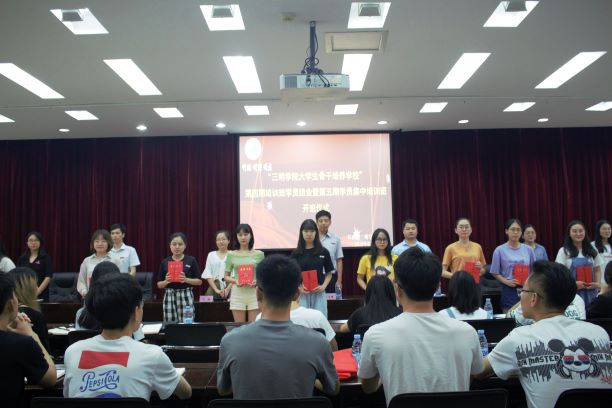 开班仪式上,第四期大骨班学员获颁结业证书;新老学员代表从“学习贯彻习近平新时代中国特色社会主义思想和党的十九大精神”“青年学生骨干的使命与担当”等角度谈信仰、讲收获、表决心,立志要以马克思主义思想武装头脑,做有责任、有担当、有本领、有行动的“三明三康”青年。开班仪式后,校团委书记叶志鹏作《从学生会、学生社团看学生骨干成长》专题讲座。