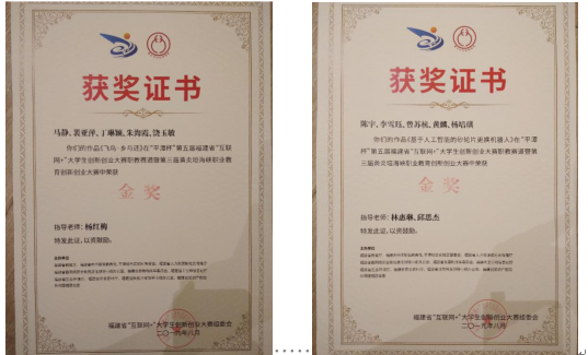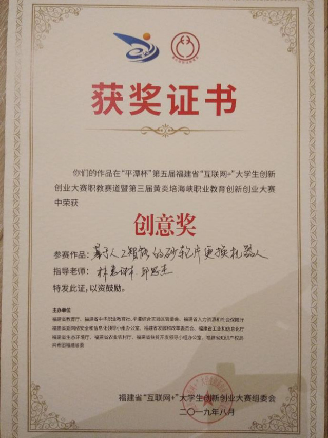“基于人工智能的砂轮片更换机器人”、“飞鸟.乡与还”两个项目均获得金奖和十佳人气奖,“基于工业以太网的嵌入式电子贾卡系统”、“AI车管家—AI行车辨识警示系统”两个项目获得铜奖。此外,“基于人工智能的砂轮片更换机器人”项目获创意奖,杨红梅、林惠琳两位教师获评大赛“优秀创新创业导师”。我校三创学院副院长黄鹏应邀在省“三创”教育研讨会上作创新创业教育工作的经验介绍。