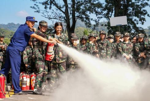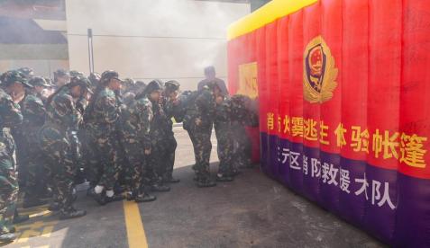 火灾模型实验区通过模型屋展示火情蔓延与宿舍防火知识;逃生帐篷模拟浓烟环境,师生按“弯腰捂口鼻”要领快速通过,教官纠正动作强化避险技能。