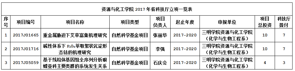 日前,2017年度福建省科技厅立项通知下达,根据“关于下达2017年省自然科学基金科技项目计划和经费(新上省级第二批)的通知”(闽财指〔2017〕330号),资源与化工学院有三个项目喜获省科技厅自然科学基金科技项目立项,获资助经费17万元。