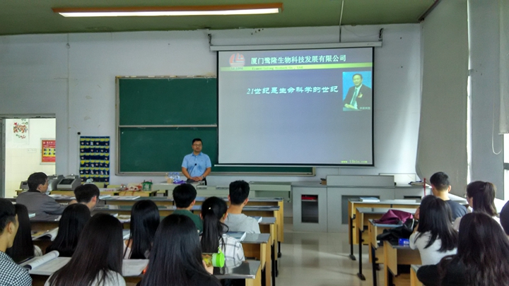 随后,鹭隆公司市场部经理李勇斌做了题为“福建省生命科学相关产业及市场现状”的主题报告。报告共分为三个部分,首先介绍了生命科学研究的主要实验步骤,接着对福建省生命科学的市场现状进行了分析,最后介绍了鹭隆生物科技发展有限公司的基本情况和主要产品与服务项目。李经理的报告既有生物学研究技术的最新动态,又结合了丰富生动的实际案例。报告内容紧扣生物技术专业前沿与行业现状,使同学们耳目一新,受益匪浅。