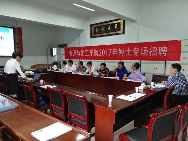 根据学校人事处招聘工作安排,4月21日资源与化工学院在理工二A306会议室组织开展2017年博士专场招聘会,本次招聘共有来自厦门大学、福州大学、福建师范大学、中国石油大学、山东大学、云南昆明植物研究所等多所高校和科研机构的15位博士到场面试。校人事处副处长陈俊树、资化学院党政领导及相关专业评委莅临指导。