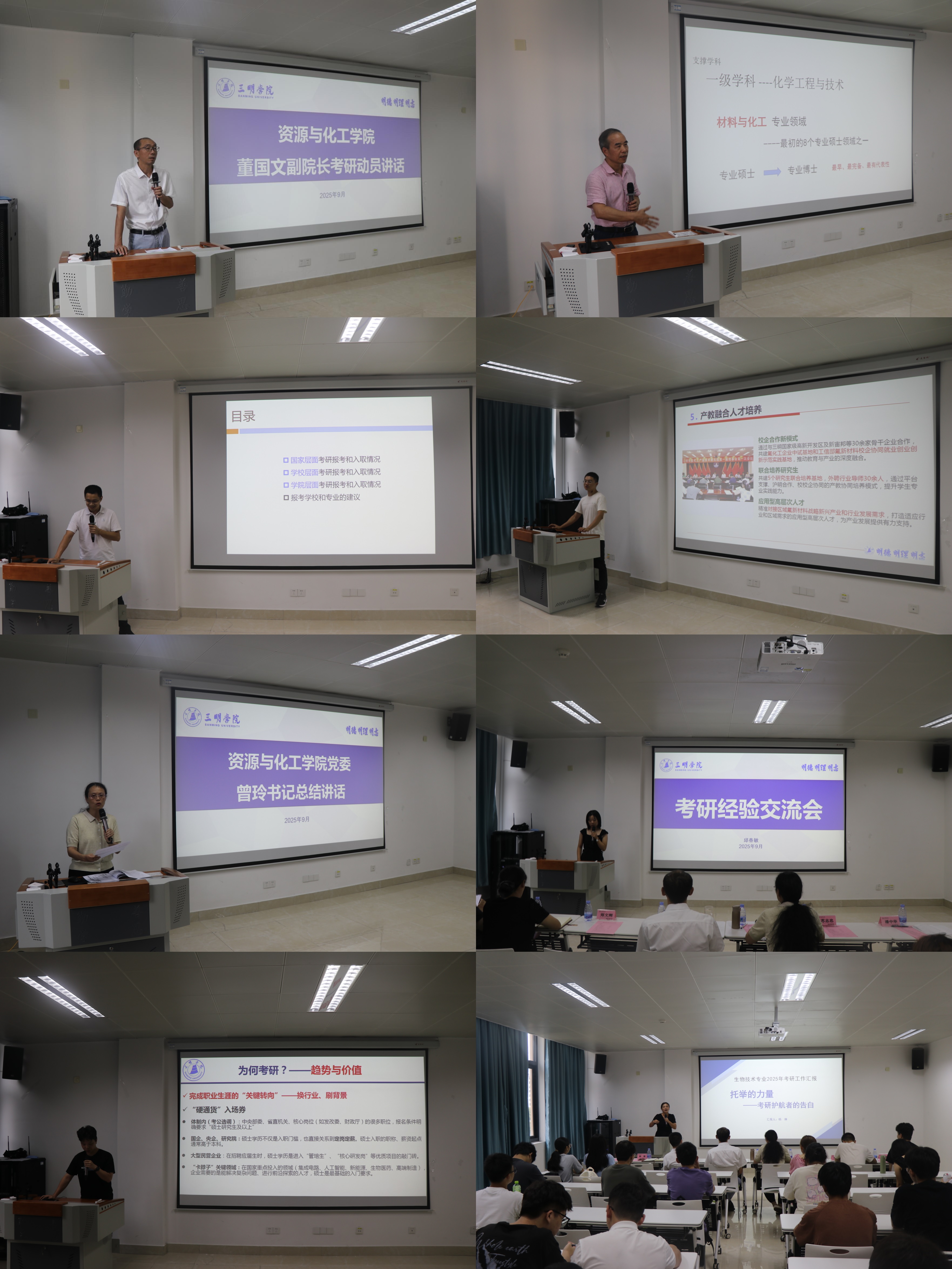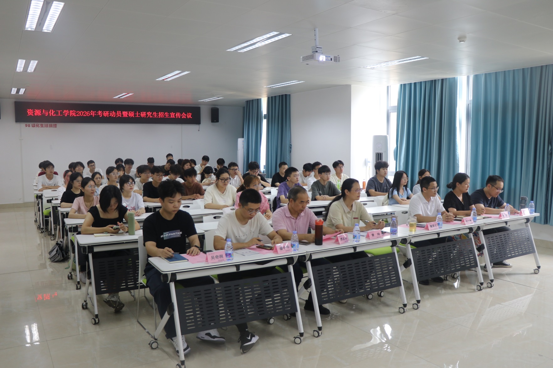 9月19日下午,资源与化工学院在工科楼A403教室成功举办2026年考研动员暨硕士研究生招生宣传会议。学院党委书记曾玲、副院长董国文、苏志忠教授、美丽中国研究院副院长郑文辉、各系主任,以及2022级、2023级意向考研学生和2024级师生代表共计100余人参加了本次会议。