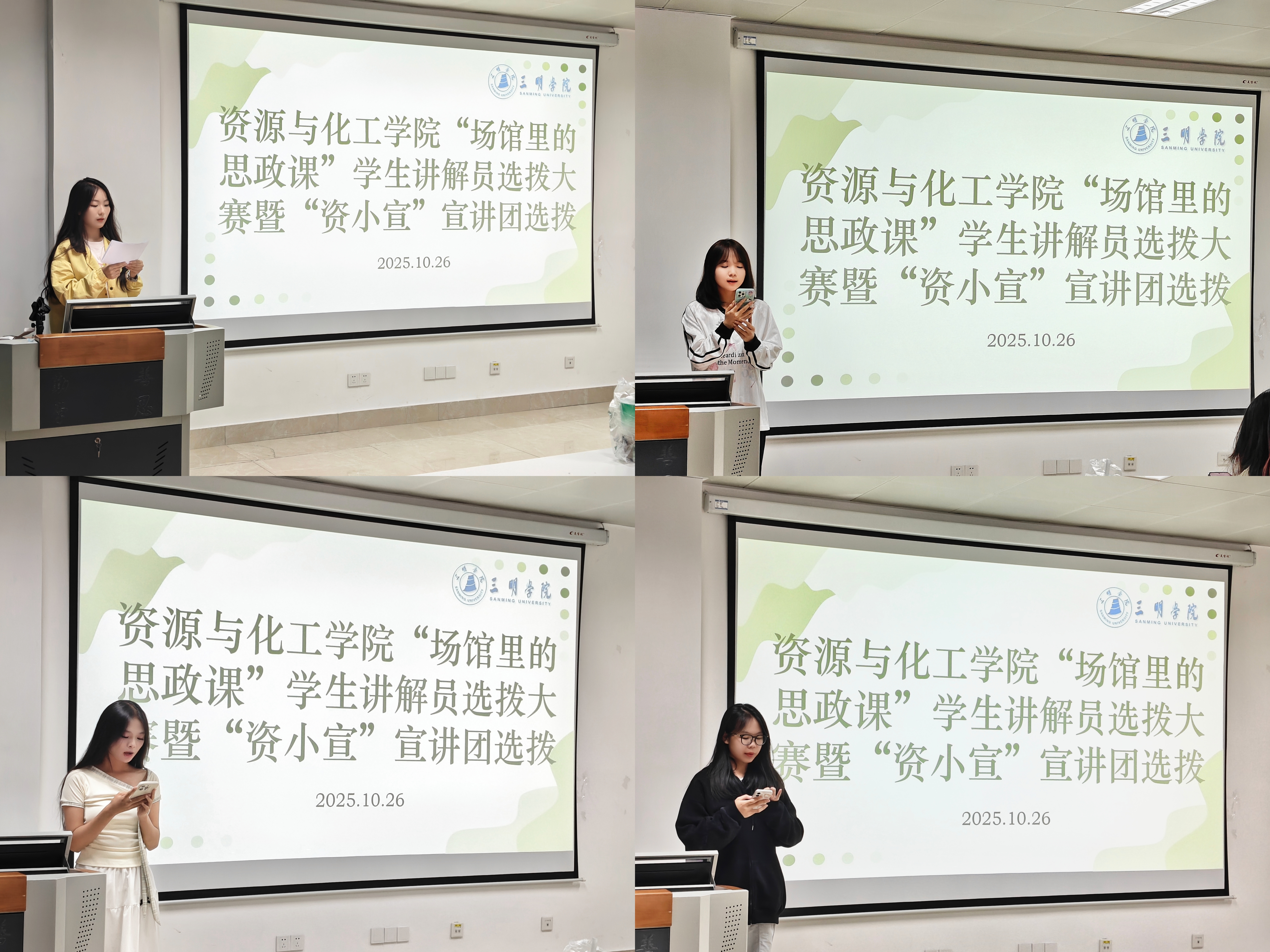为深耕学校育人场馆资源,将静态建筑与文物转化为鲜活 “思政教材”,10月26日,资源与化工学院联合荷花苑6C楼栋团总支,在工科楼A403教室开展“一站式”学生社区“场馆里的思政课”学生讲解员选拔大赛暨“资小宣”宣讲团选拔活动。