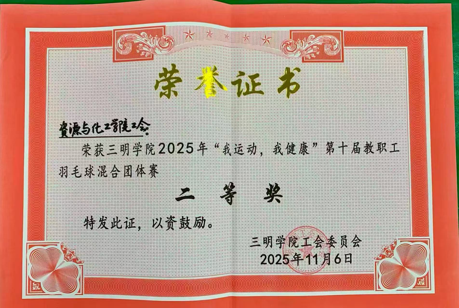 为积极响应全民健身号召,丰富教职工业余文化生活,11月3日至6日,由校工会主办、校教工羽毛球协会承办的三明学院2025年“我运动 我健康”第十届教职工羽毛球混合团体赛顺利举行。在本届比赛中,资源与化工学院工会代表队团结协作、奋勇拼搏,最终荣获二等奖佳绩!
