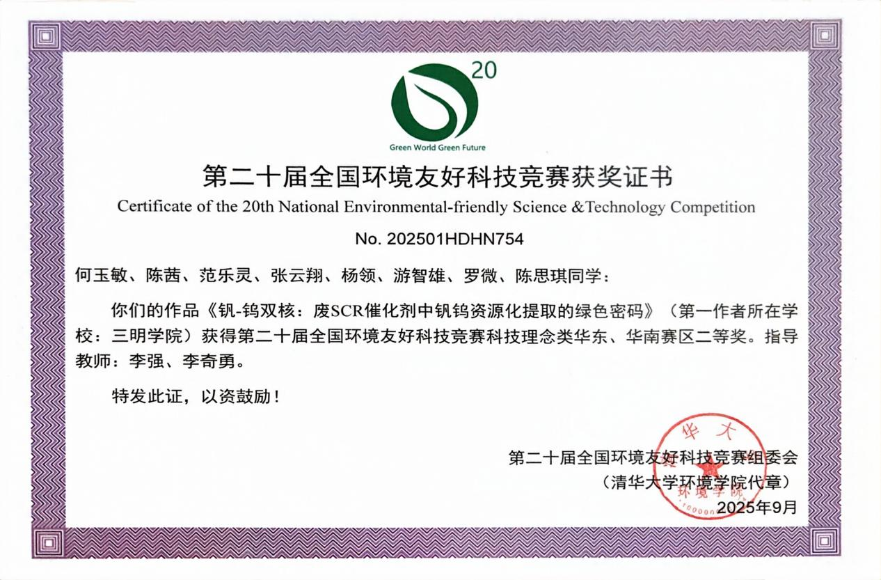 在全国环境友好科技竞赛中,学院参赛团队凭借作品《钒-钨双核:废SCR催化剂中钒钨资源化提取的绿色密码》,突破废催化剂资源化技术难点,荣获科技理念类华东、华南赛区二等奖。