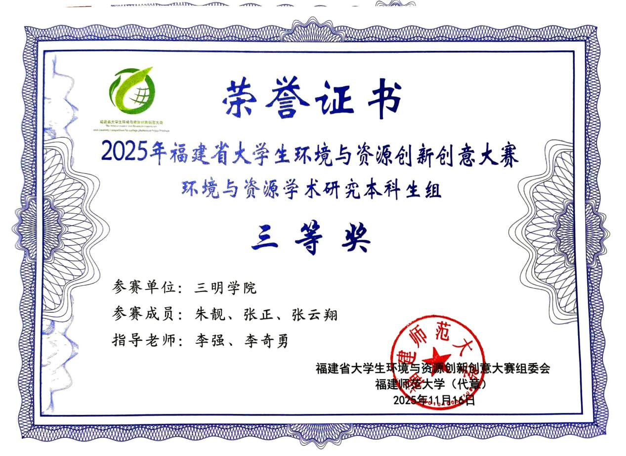 近日,三明学院资源与化工学院学子在李强、李奇勇等教师指导下,在第二十届全国环境友好科技竞赛、2025年福建省大学生环境与资源创新创意大赛中接连取得优异成绩,充分彰显学院在环境资源领域的人才培养质量与科研创新活力。