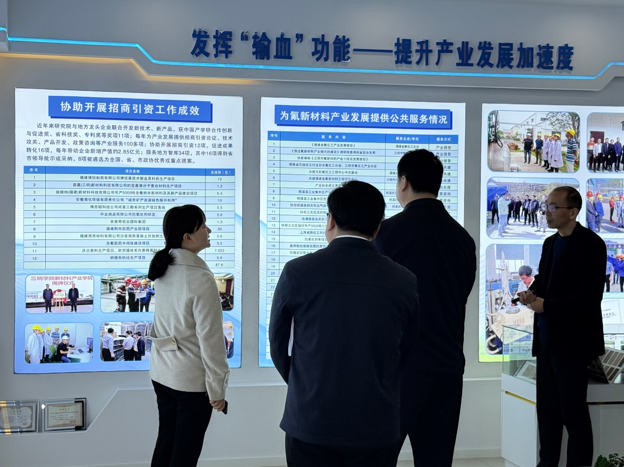12月8日下午,明溪县委书记陈华伟、县长张文静一行莅临氟化工研究院展厅参观交流,实地调研氟化工领域科技创新与成果转化工作。吴龙副校长,党政办、社会合作处相关负责人陪同考察,董国文副院长全程讲解。