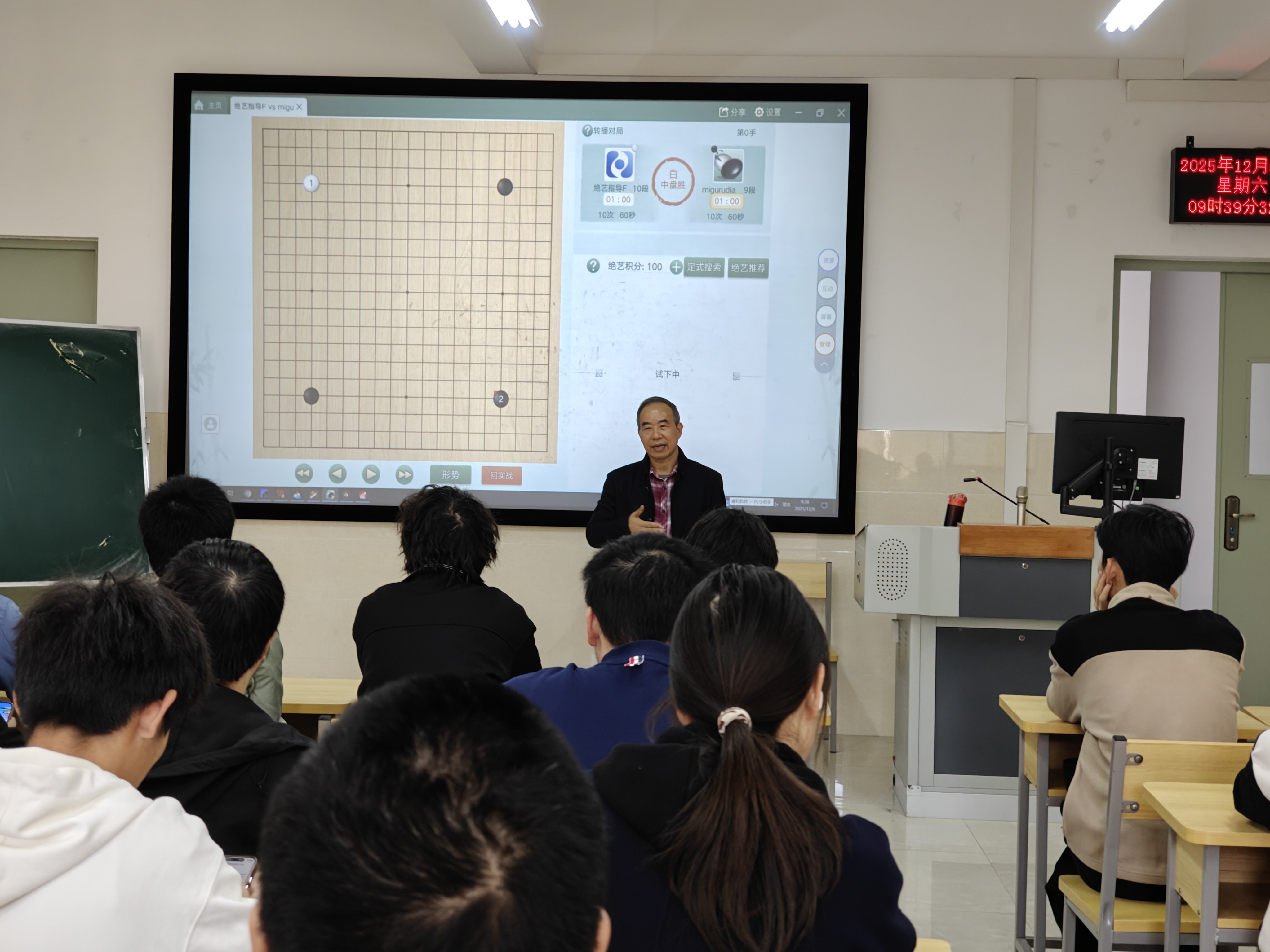活动现场氛围庄重而轻松。苏老师借助大屏幕上的对弈实例,从围棋的历史起源与基本规则讲起,逐步解析棋子布局、死活题解题等核心技巧,并巧妙融合围棋中蕴含的逻辑思维与人生哲学,以通俗易懂的语言,将抽象的战略战术娓娓道来,引人入胜。台下同学们全神贯注,时而凝神聆听,时而沉思棋路记录重点内容。互动环节中,苏老师耐心解答大家的疑问,从基础落子到高阶思路,层层展开讲解,现场交流气氛热烈。参与同学不仅学到了围棋知识,也深切体会到中华传统棋艺的深厚魅力。